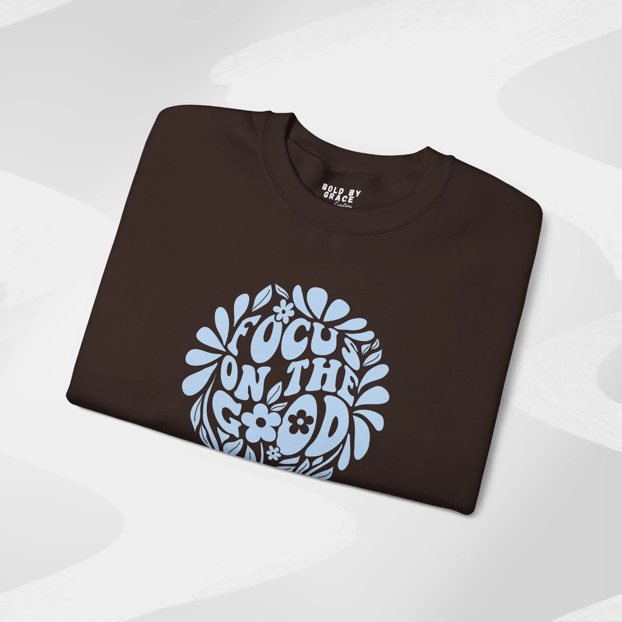 A clean, cozy crewneck sweatshirt that settles like a quiet reminder. Soft medium-weight fabric and a classic cut make it easy to layer over tees or sleep in on slow mornings. The front carries a light, hand-drawn circular motif with calming florals and the phrase “focus on the good” rendered in a pale powder-blue — gentle, understated, and calm rather than loud. Wear it when you need a little nudge toward presence: at a weekend café, while journaling at home, or during a low-key group study session. The breathable cotton-poly blend keeps warmth without overheating, and the flat, ribbed collar and reinforced stitching hold shape through repeated washes.