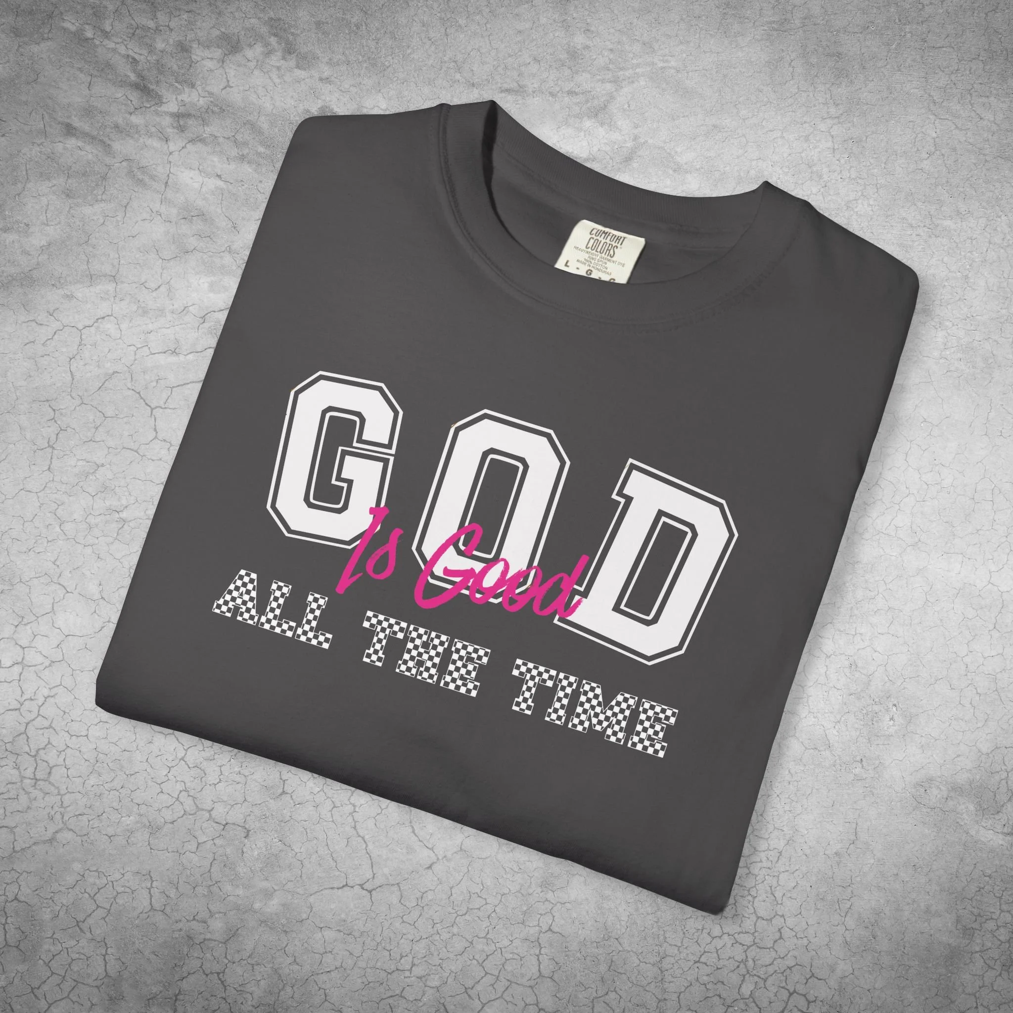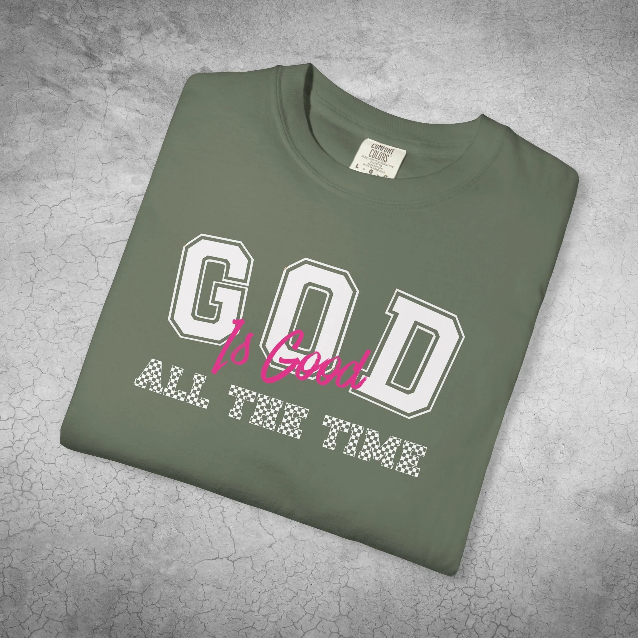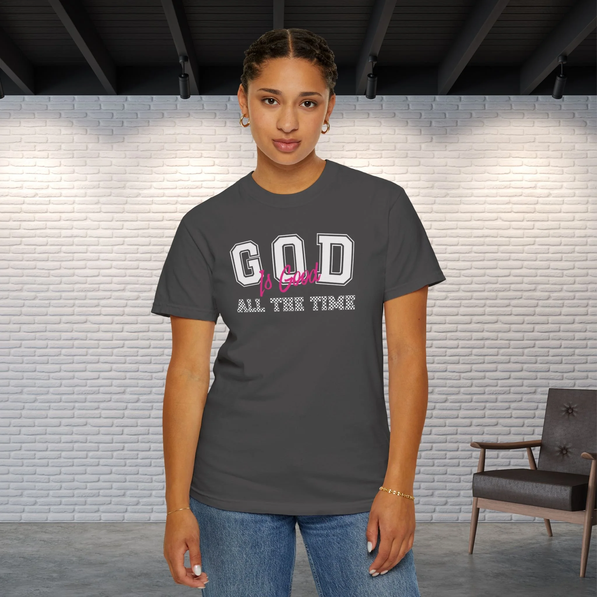 This relaxed garment-dyed tee carries a quiet, confident message—soft, lived-in color and a collegiate-style print that reads like a personal reminder. The heavyweight cotton drapes casually on the shoulders and breaks in with wear, becoming more comfortable over time. It works as an everyday layer for those who appreciate understated faith-forward graphics and vintage athletic vibes. Wear it to low-key gatherings, weekend errands, group meetups, or when you want clothing that feels familiar from the first wear. The subtle khaki tone and muted print let it pair easily with denim, joggers, or under a flannel for cooler evenings.