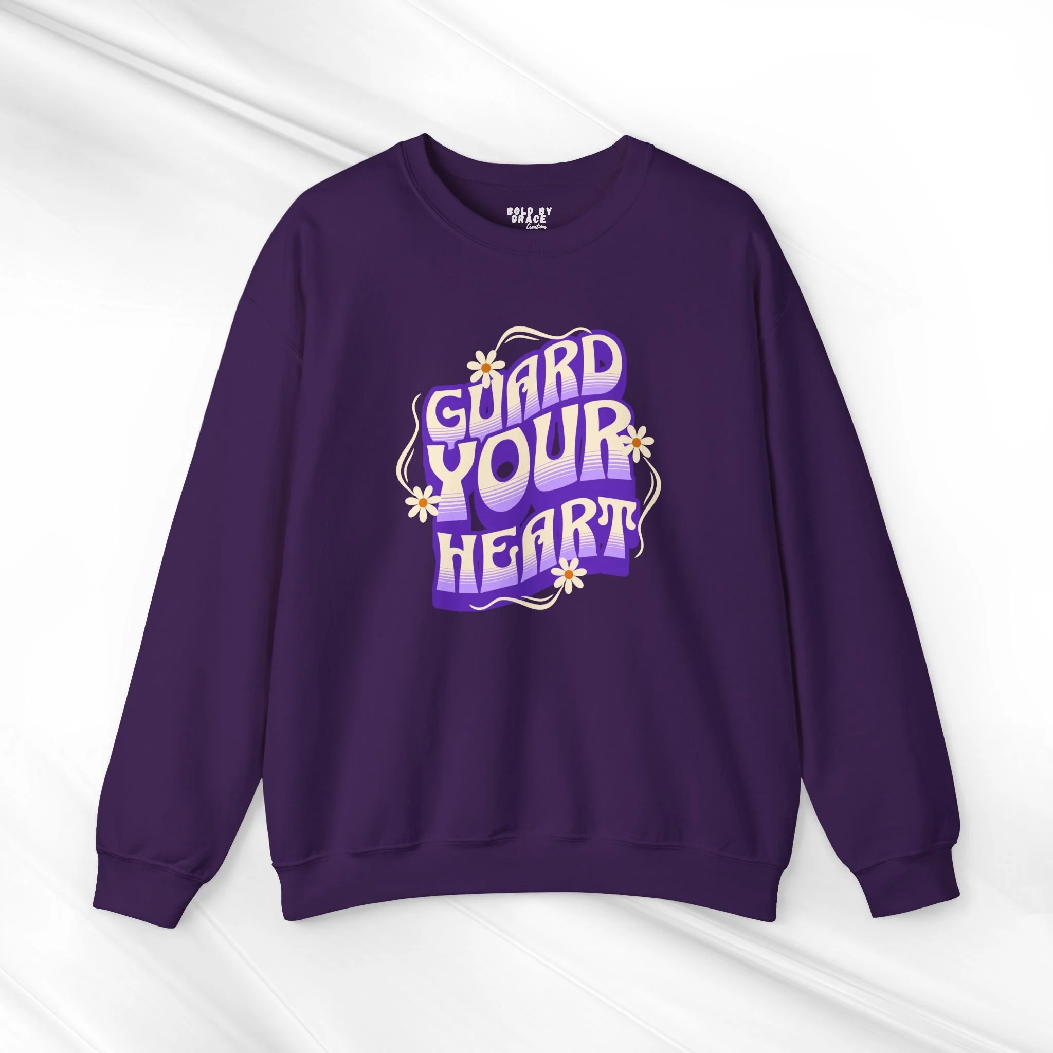 Soft, cozy, and a little playful — this crewneck brings a warm, nostalgic vibe to everyday wear. The white sweatshirt features a bold, retro-inspired “Guard Your Heart” design in purple with small star accents, sitting centered on the chest. The mid-weight cotton-poly blend feels substantial without being heavy, and the classic crew neckline and clean-cut fit make it easy to layer or wear on its own. Wear it on slow mornings with coffee, on evening walks, or when you want to send a gentle message without saying a word.