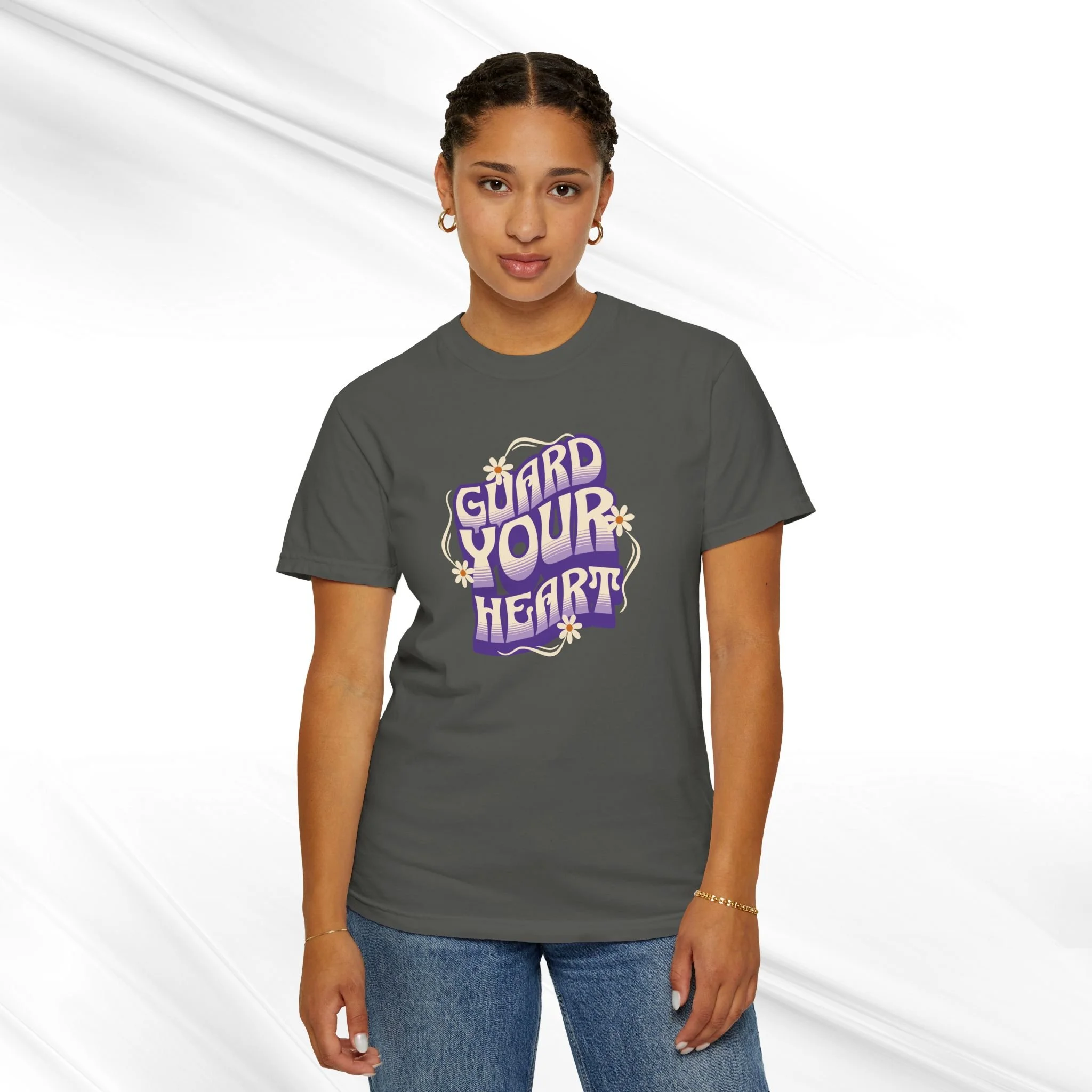 Soft, slightly lived-in cotton meets a bold, nostalgic message. This garment-dyed tee carries a warm, worn-in feel from the first wear — the kind of shirt you reach for when you want comfort and a little attitude. The front artwork reads “Guard Your Heart” in retro-curved lettering with purple and gold tones and tiny star accents. It reads like a personal reminder: steady, gentle, and a little defiant. Wear it on slow mornings with coffee, on city walks when you need a quiet armor, or at small gatherings where honest conversations matter. The relaxed fit and heavy-weight cotton drape confidently while the tubular knit and double-needle seams keep the silhouette clean and simple.