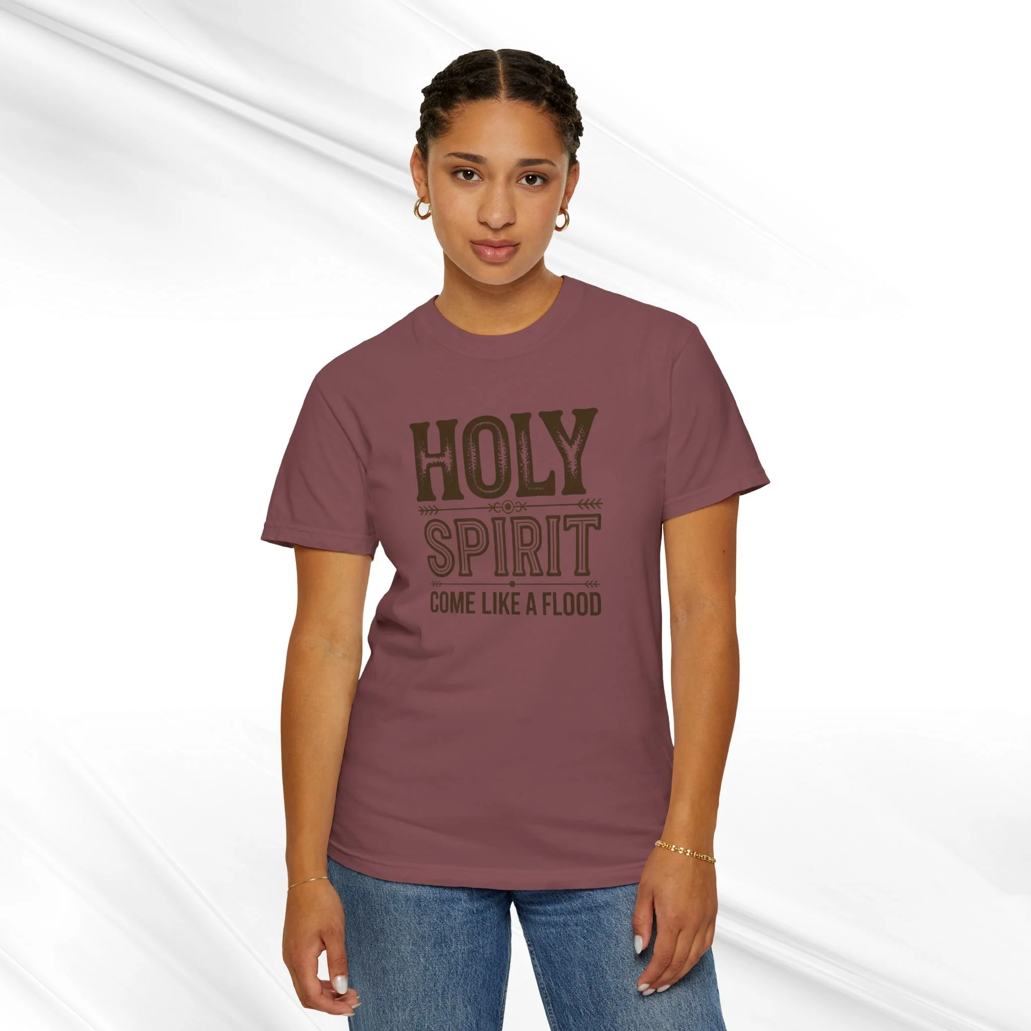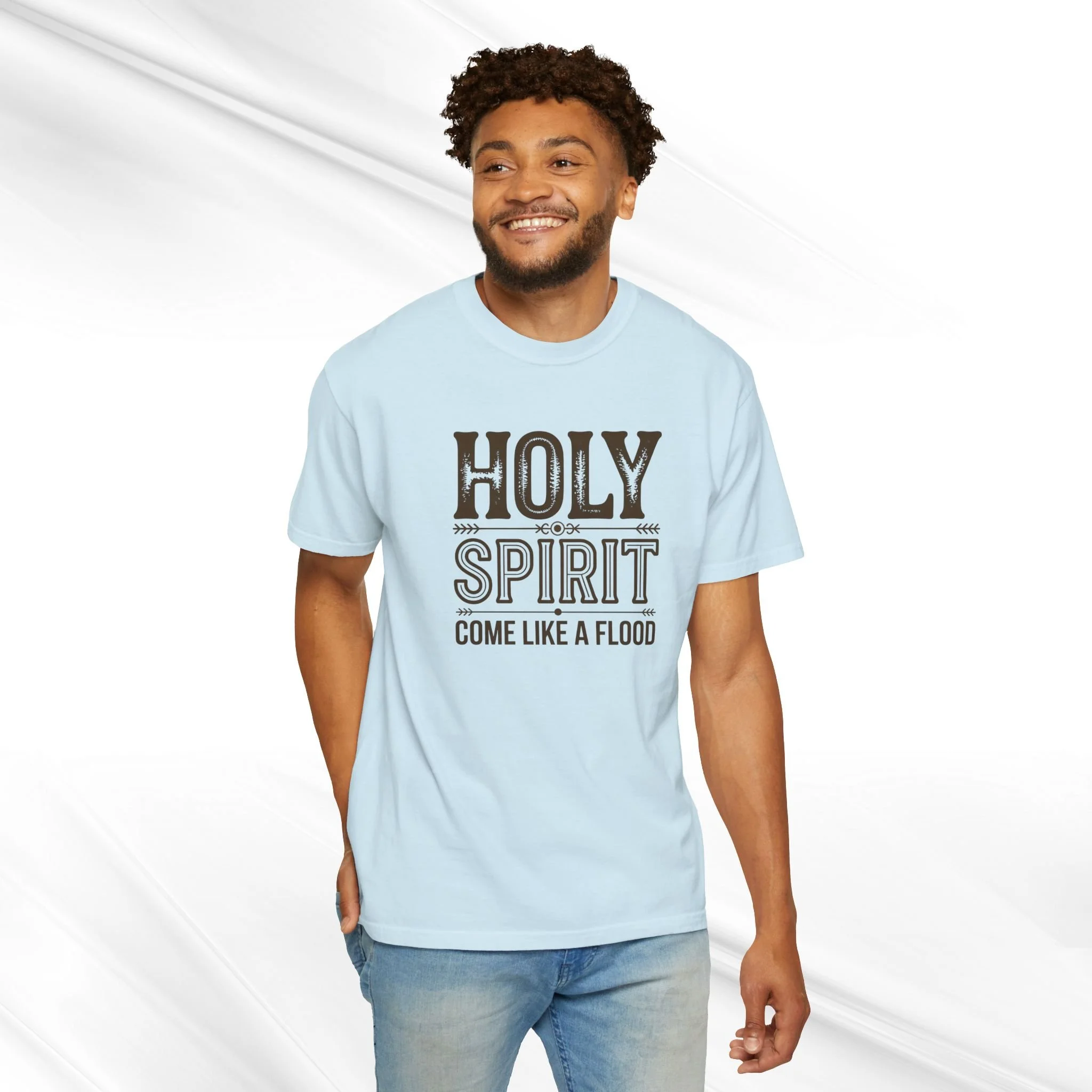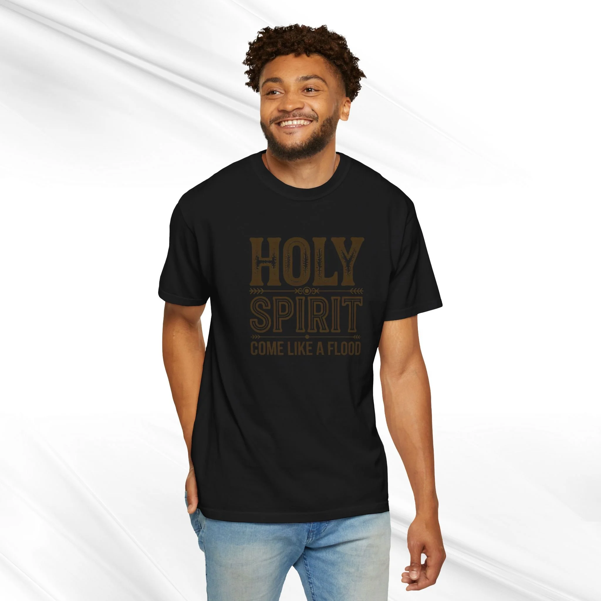 Wear your faith with quiet confidence. This heavyweight garment-dyed tee carries a bold, vintage-inspired front print reading “HOLY SPIRIT — COME LIKE A FLOOD,” balanced with clean negative space and a relaxed silhouette. The soft, lived-in color and textured feel from garment dyeing give it a worn-in comfort from the first wear. It sits loose for easy movement and layers well under jackets or over flannels for worship nights, volunteer shifts, or everyday moments of stillness. The design speaks to seekers and worshippers who want a simple, honest way to share their belief without shouting — an approachable piece for church gatherings, retreats, mission trips, or late-night prayer circles.