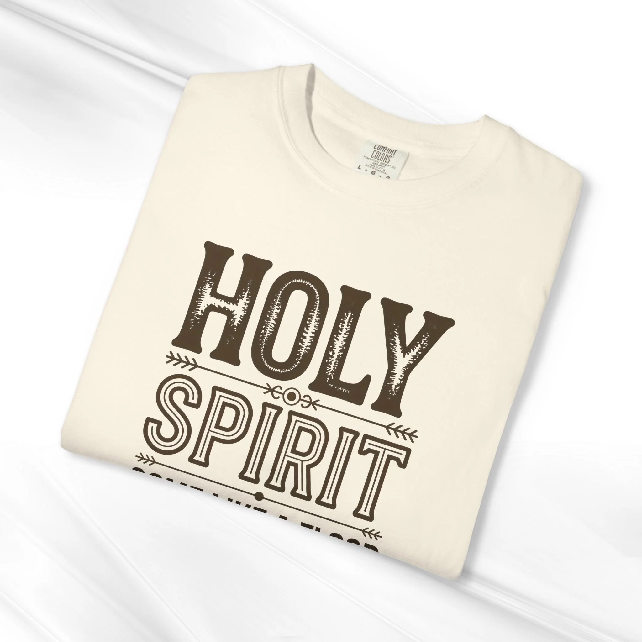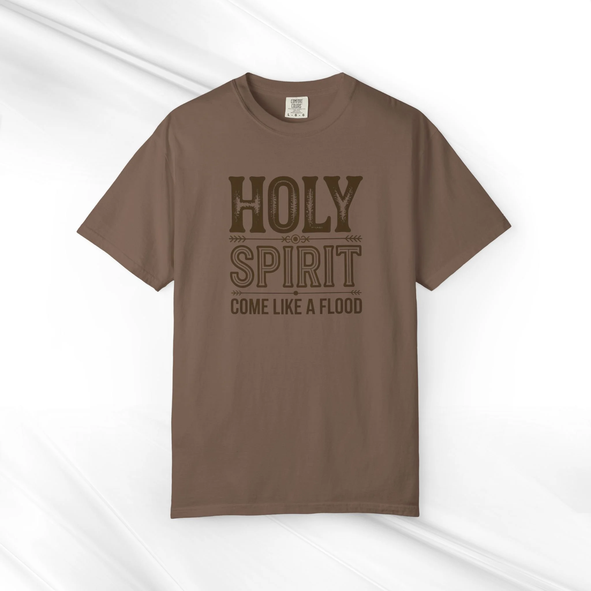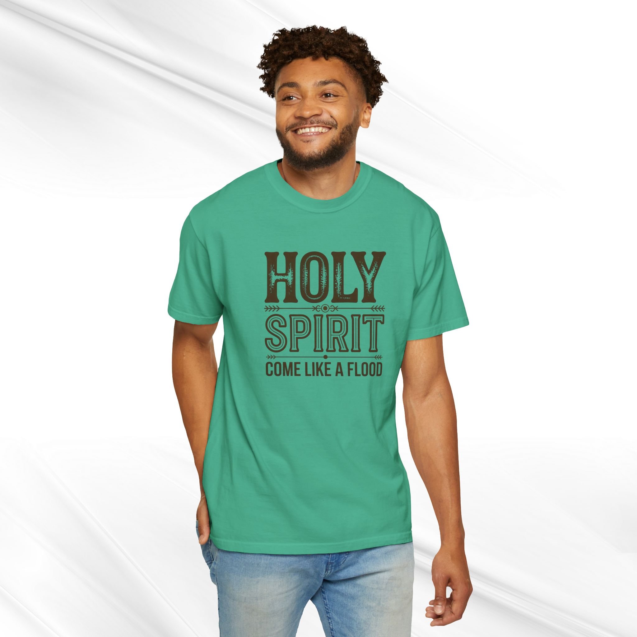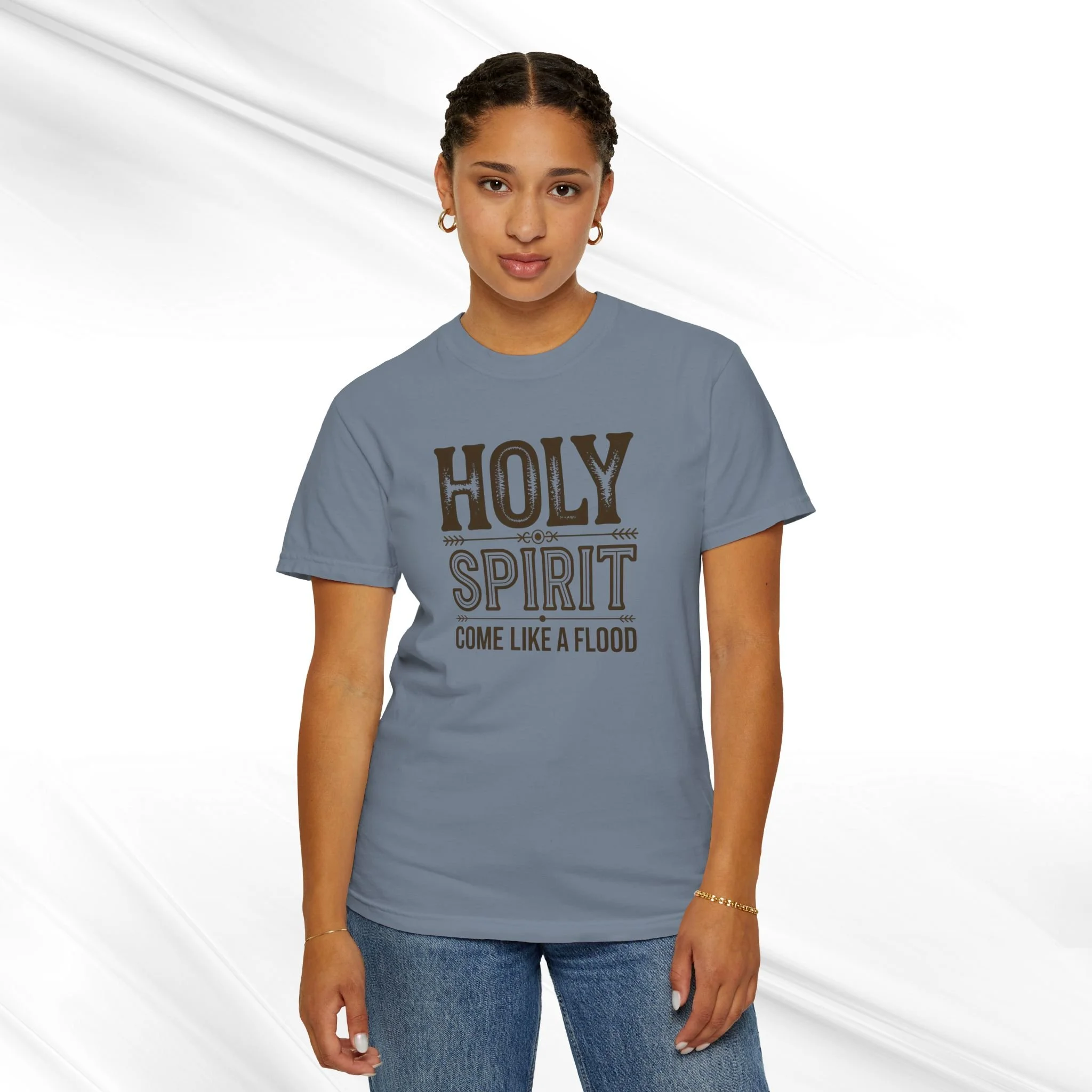 Wear your faith with quiet confidence. This heavyweight garment-dyed tee carries a bold, vintage-inspired front print reading “HOLY SPIRIT — COME LIKE A FLOOD,” balanced with clean negative space and a relaxed silhouette. The soft, lived-in color and textured feel from garment dyeing give it a worn-in comfort from the first wear. It sits loose for easy movement and layers well under jackets or over flannels for worship nights, volunteer shifts, or everyday moments of stillness. The design speaks to seekers and worshippers who want a simple, honest way to share their belief without shouting — an approachable piece for church gatherings, retreats, mission trips, or late-night prayer circles.