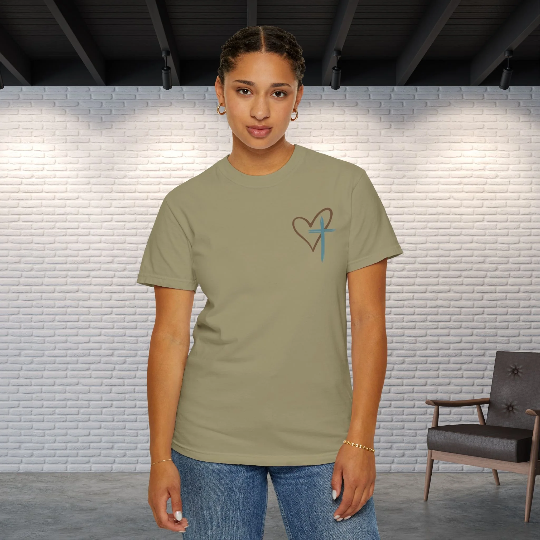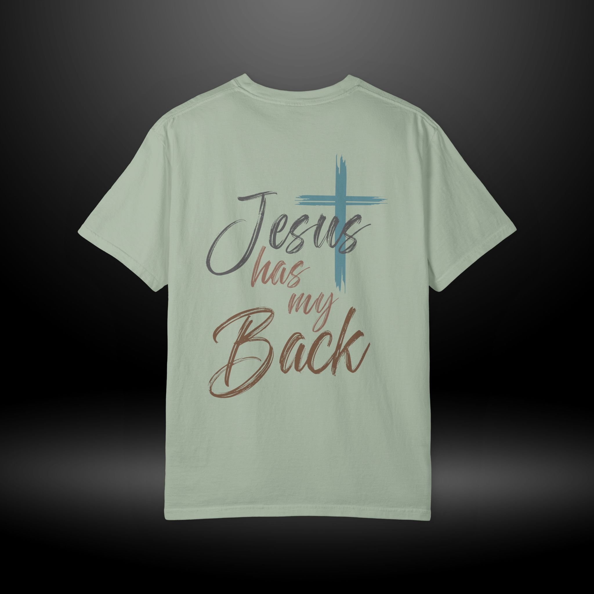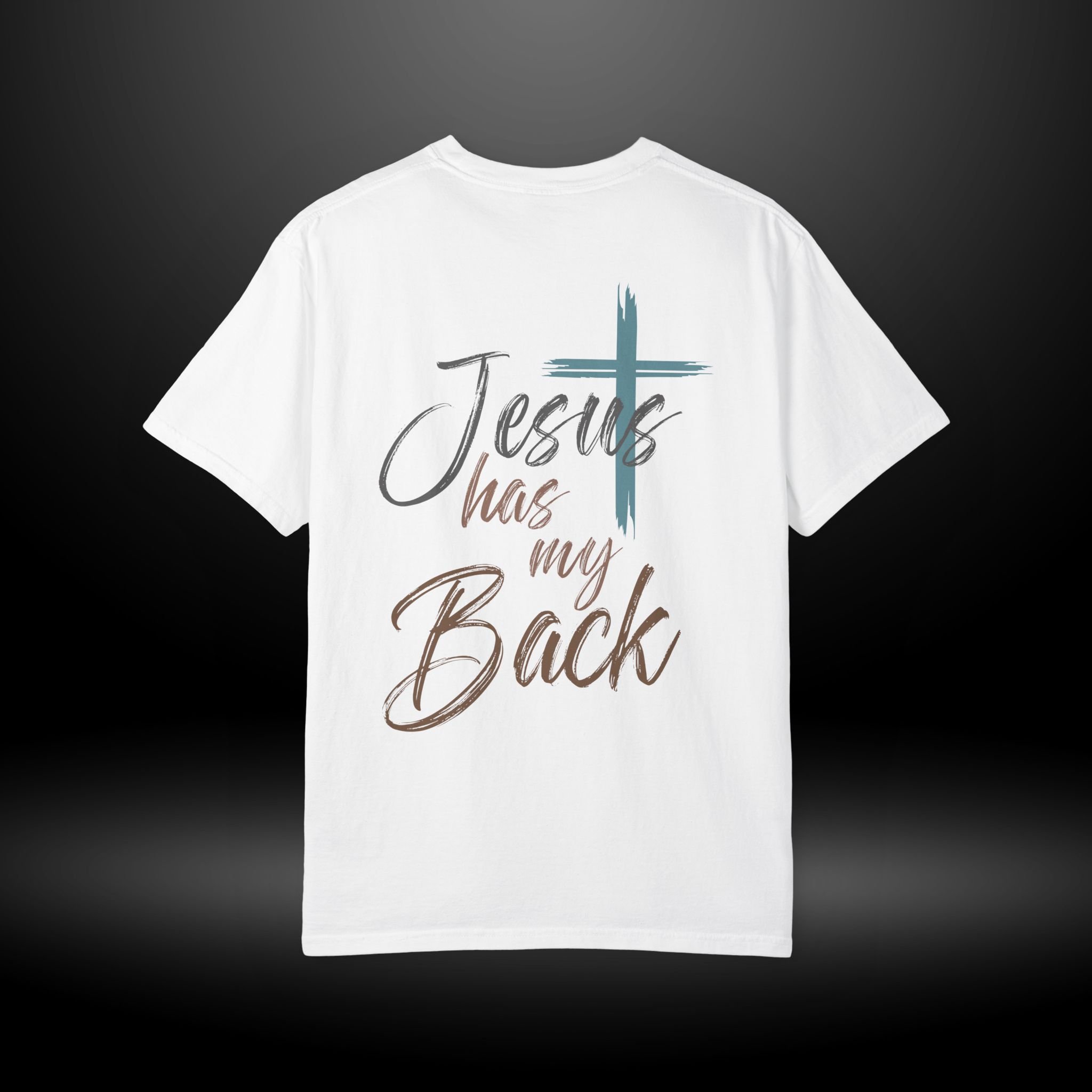 Soft, lived-in, and quietly confident — this garment-dyed tee carries a calm faith-forward message. A subtle heart-and-cross mark rests on the chest while the back reads “Jesus has my Back” in painterly brushstrokes, layered with a worn teal cross. It feels like a trusted companion for Sundays, volunteer days, and casual moments when you want your belief to speak gently. The heavyweight cotton and relaxed fit give it a roomy, comforting drape that wears better with each wash. Choose a muted color to let the script and cross stand out, or pick a deeper dye for a more vintage, faded look that blends into weekend routines.