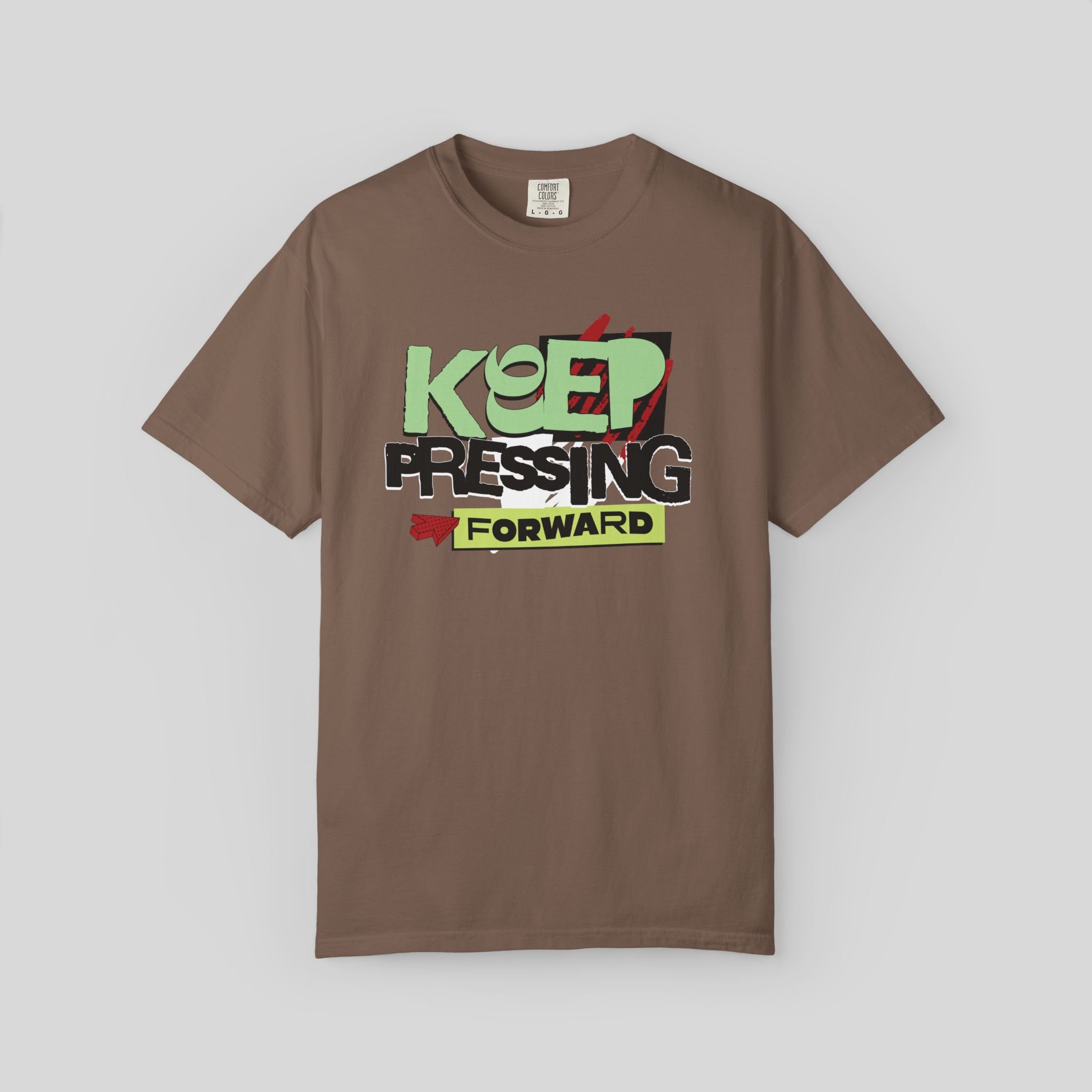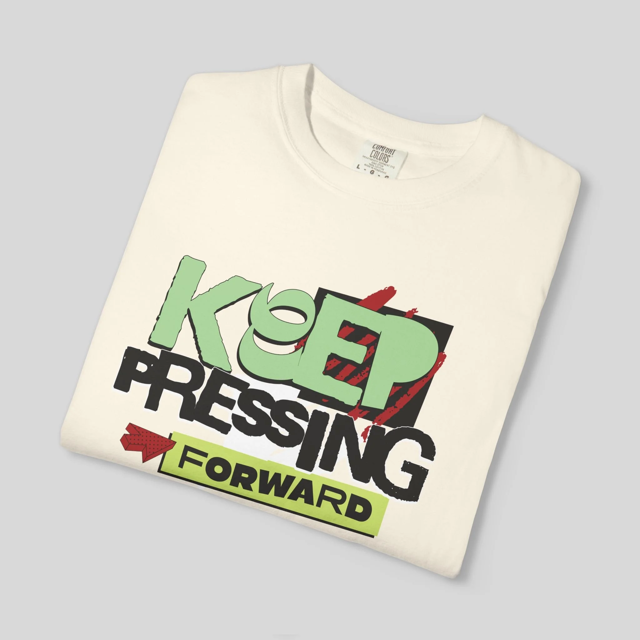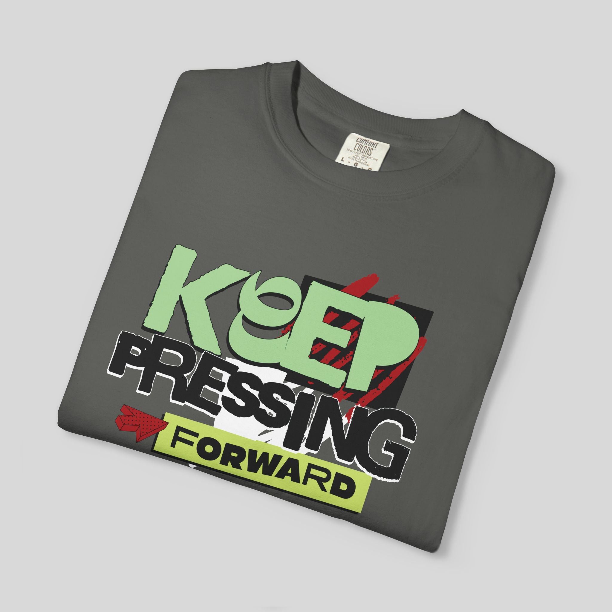 This heavyweight garment-dyed tee wears confidence like a second skin. The relaxed fit and soft, washed-in color invite everyday movement while the bold, hand-drawn “KEEP PRESSING FORWARD” graphic adds an optimistic edge. Built to last with double-needle seams, tubular knit construction, and pre-shrunk ring-spun cotton, it feels lived-in from day one and keeps its shape through the long haul.