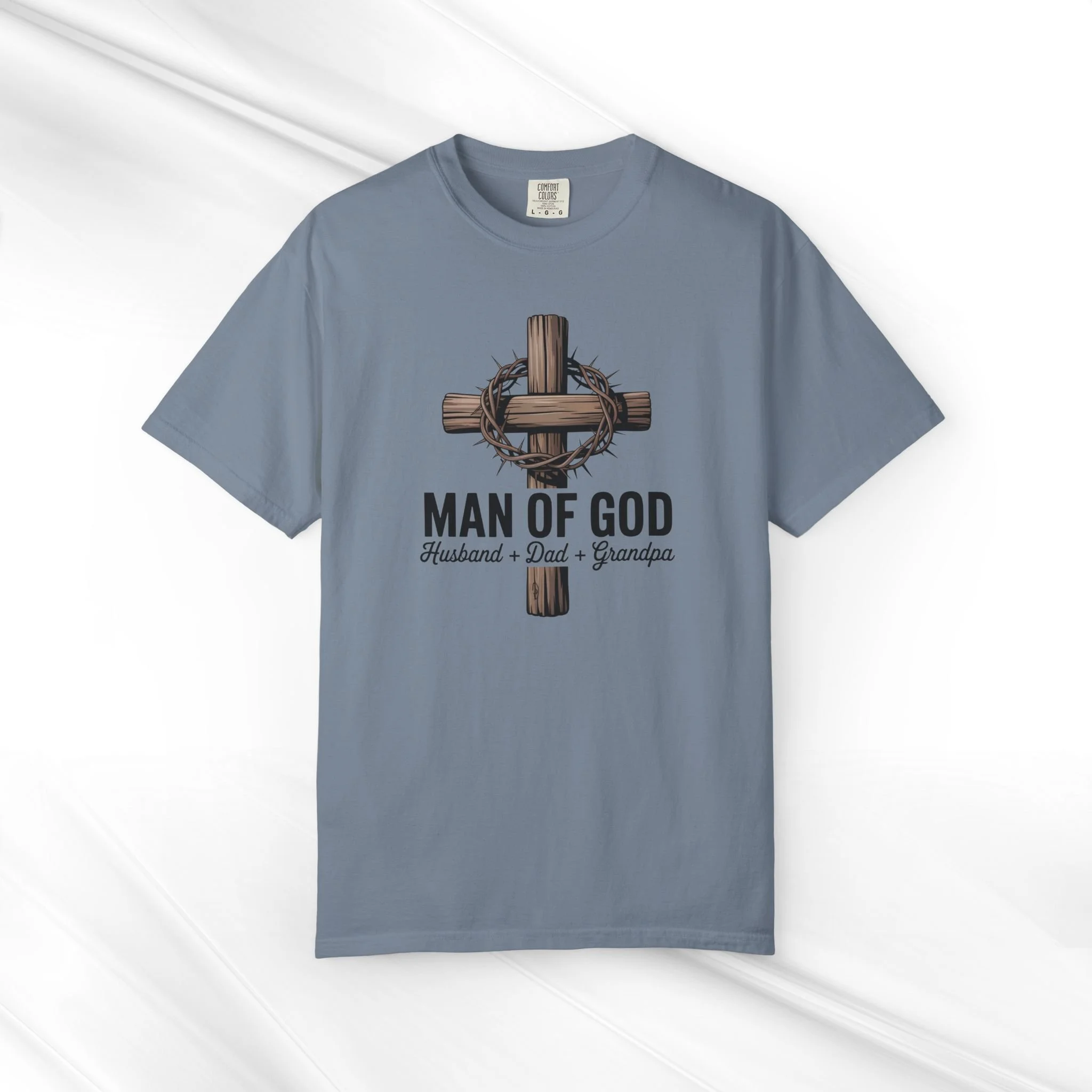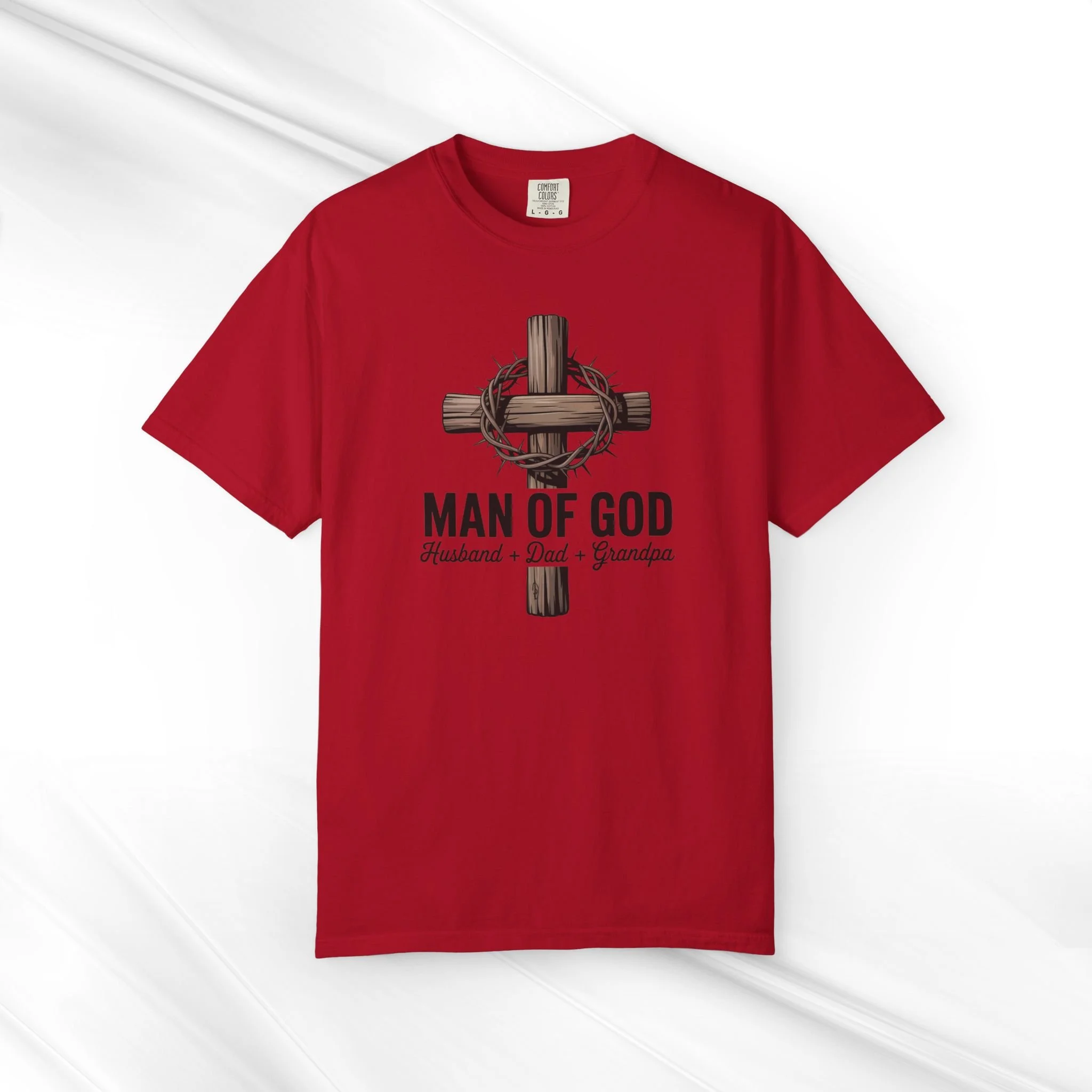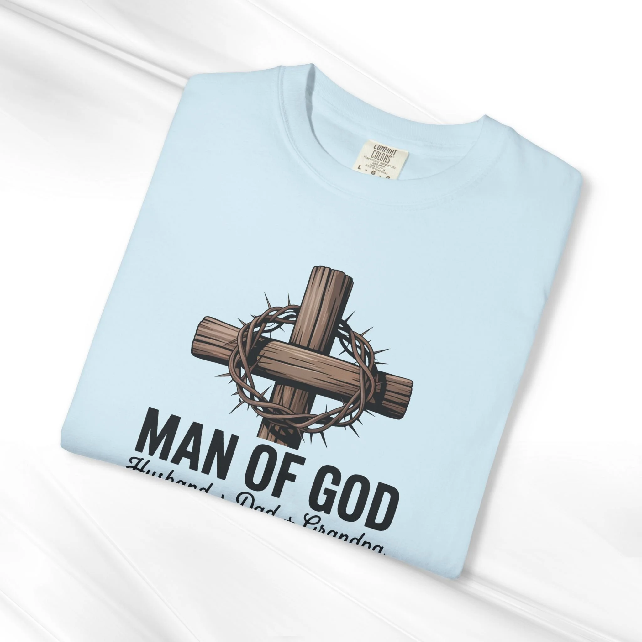 This garment-dyed tee carries a quiet, steady confidence—soft to the touch yet built to last. The front artwork centers on a wooden cross wrapped with a crown of thorns and the words “MAN OF GOD” with smaller text honoring husband, dad, grandpa. It feels like a familiar pulpit hymn and Sunday porch conversation rolled into one shirt: humble, steadfast, and reflective. The relaxed, heavyweight cotton drape gives the design room to breathe while the muted, lived-in color from garment dyeing adds a worn-in character that deepens with every wash. Wear it to church, family gatherings, or slow mornings with coffee. It layers easily under a flannel or over a favorite workshirt and ages into a trusted go-to that quietly speaks faith and family.