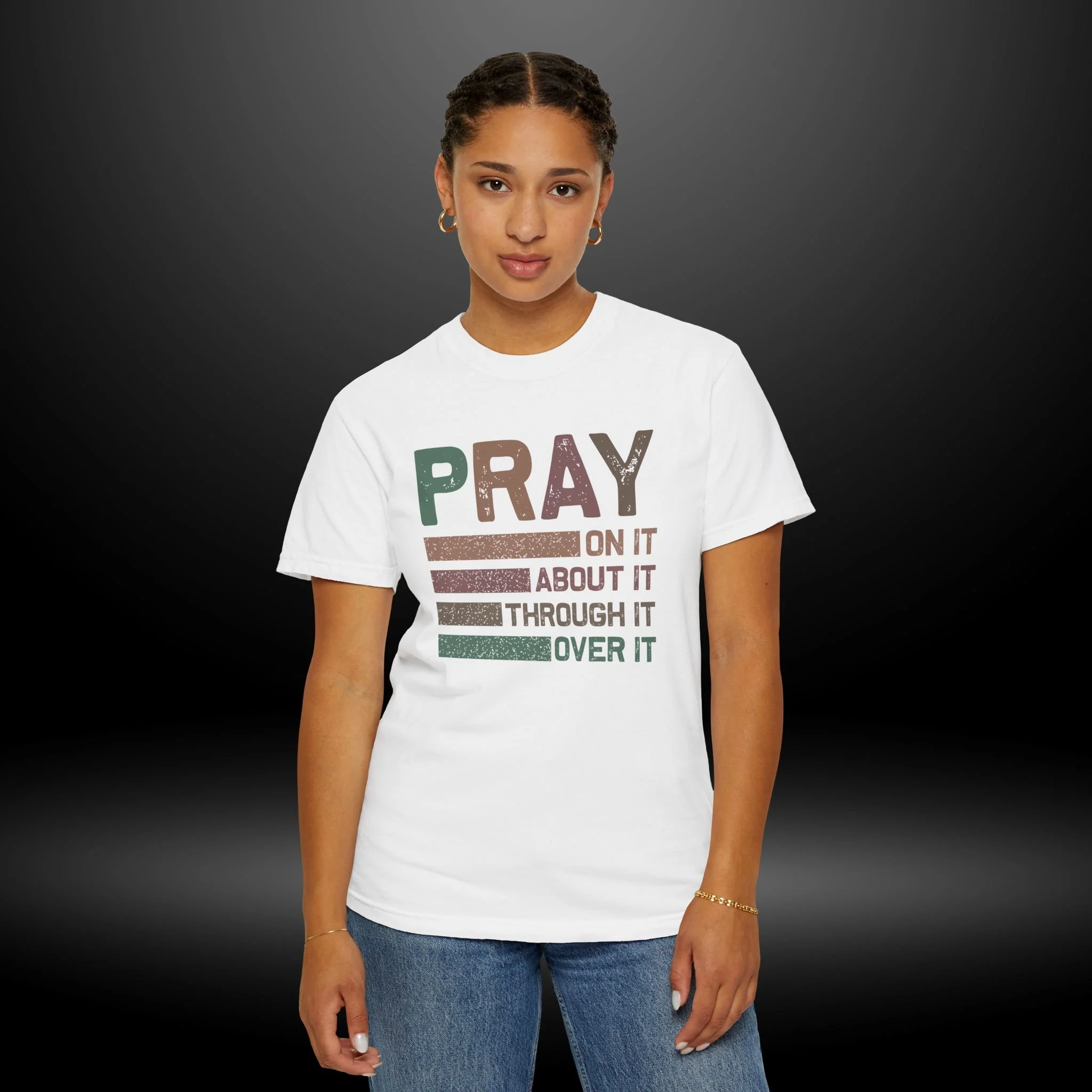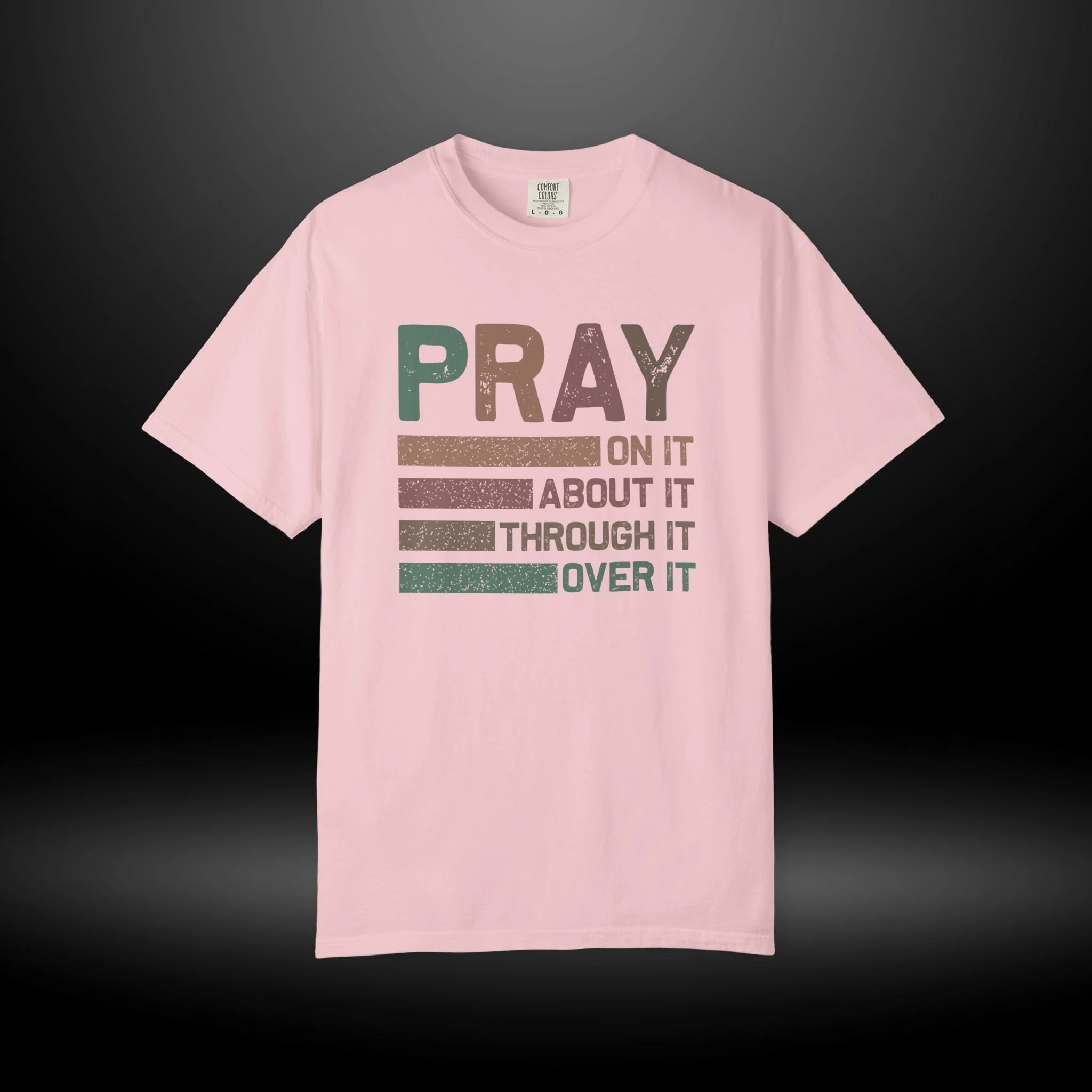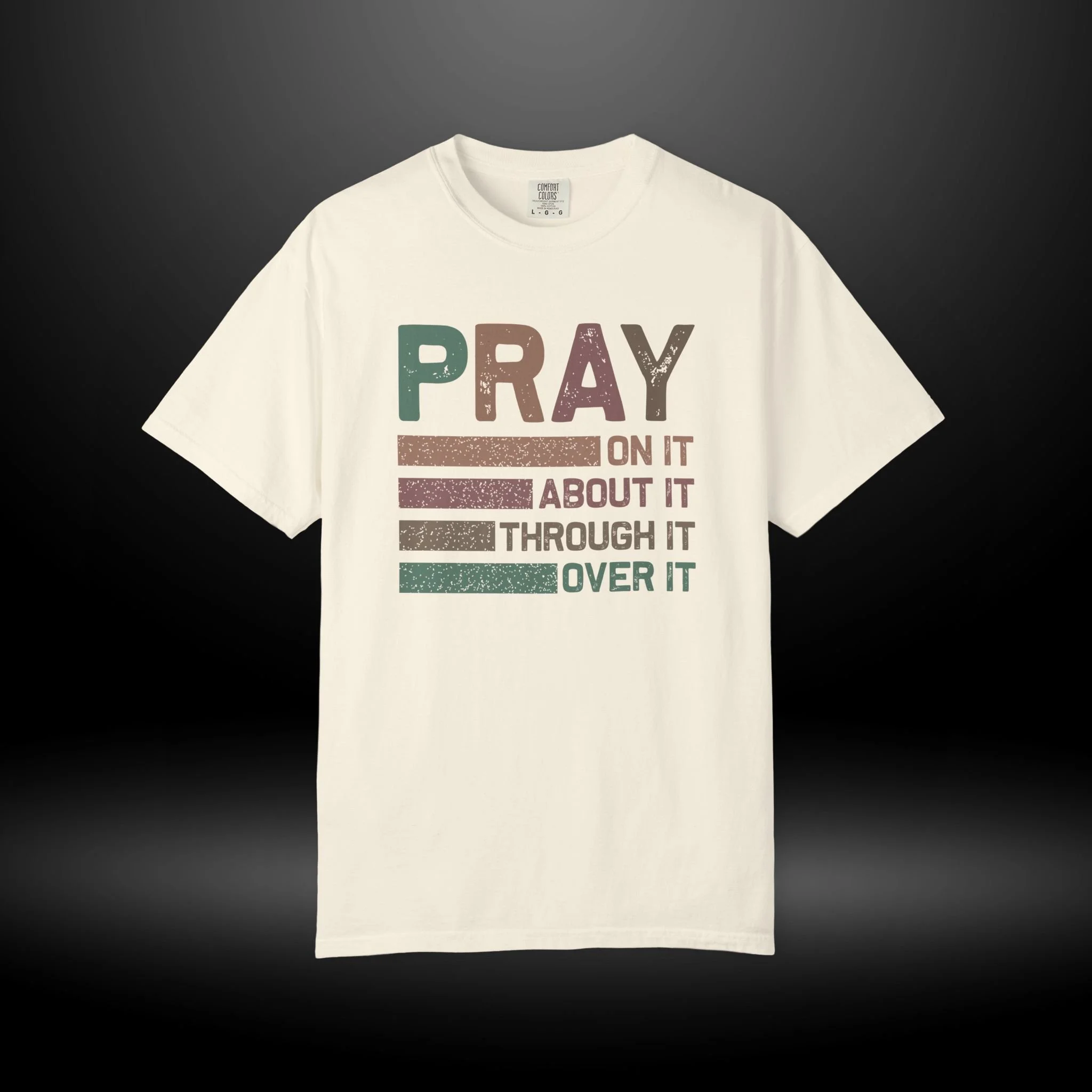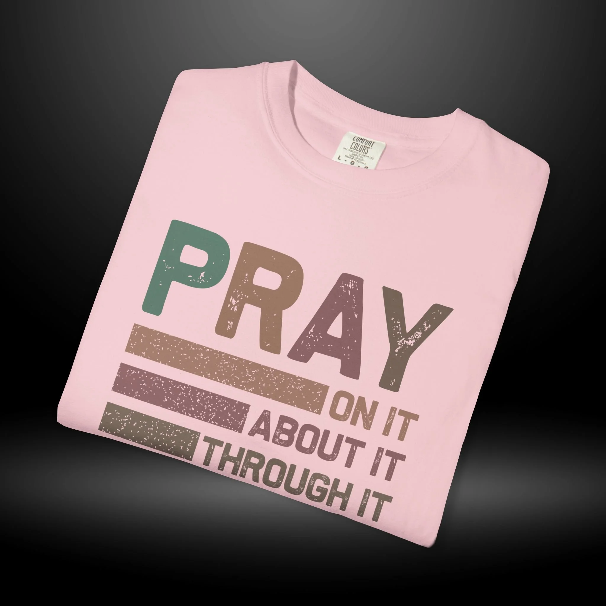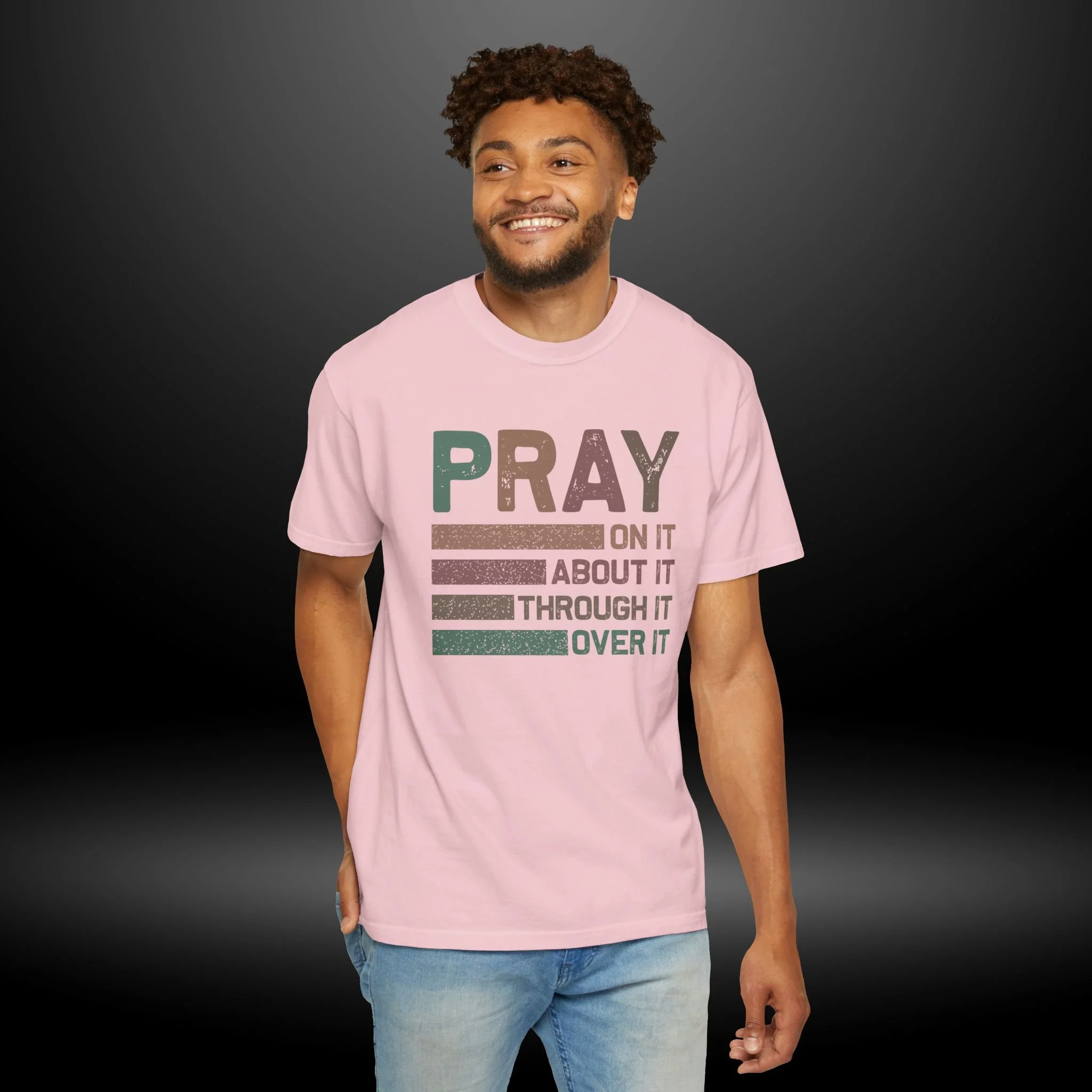 This heavyweight, garment-dyed tee carries a quiet confidence — soft, lived-in color with a message that sits like a steadying hand. The front design reads PRAY in bold distressed letters with stacked lines and the phrases: "On it, About it, Through it, Over it." Wear it when you want your faith to speak calmly but clearly: during small group nights, slow mornings, volunteer days, or while visiting friends who need encouragement. The relaxed fit and pre-shrunk, ring-spun cotton make it comfortable for all-day wear, while the garment-dyed finish gives each shirt subtle texture and depth. It’s made to be reached for again and again — a tactile reminder to breathe, lean in, and keep going.