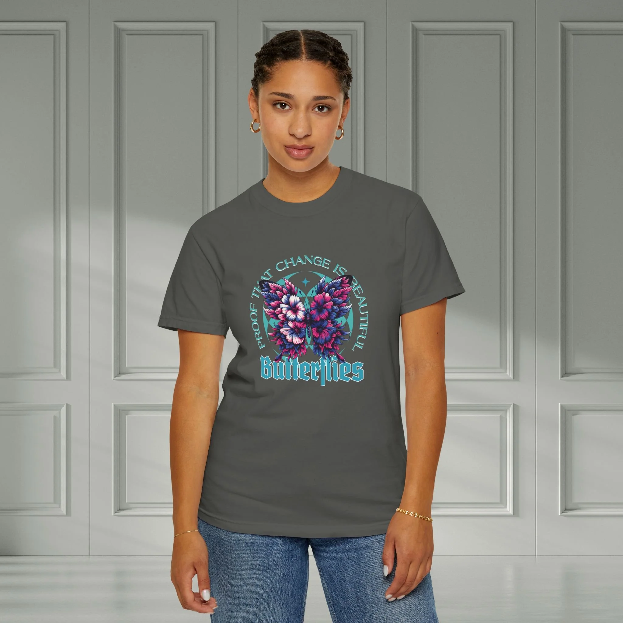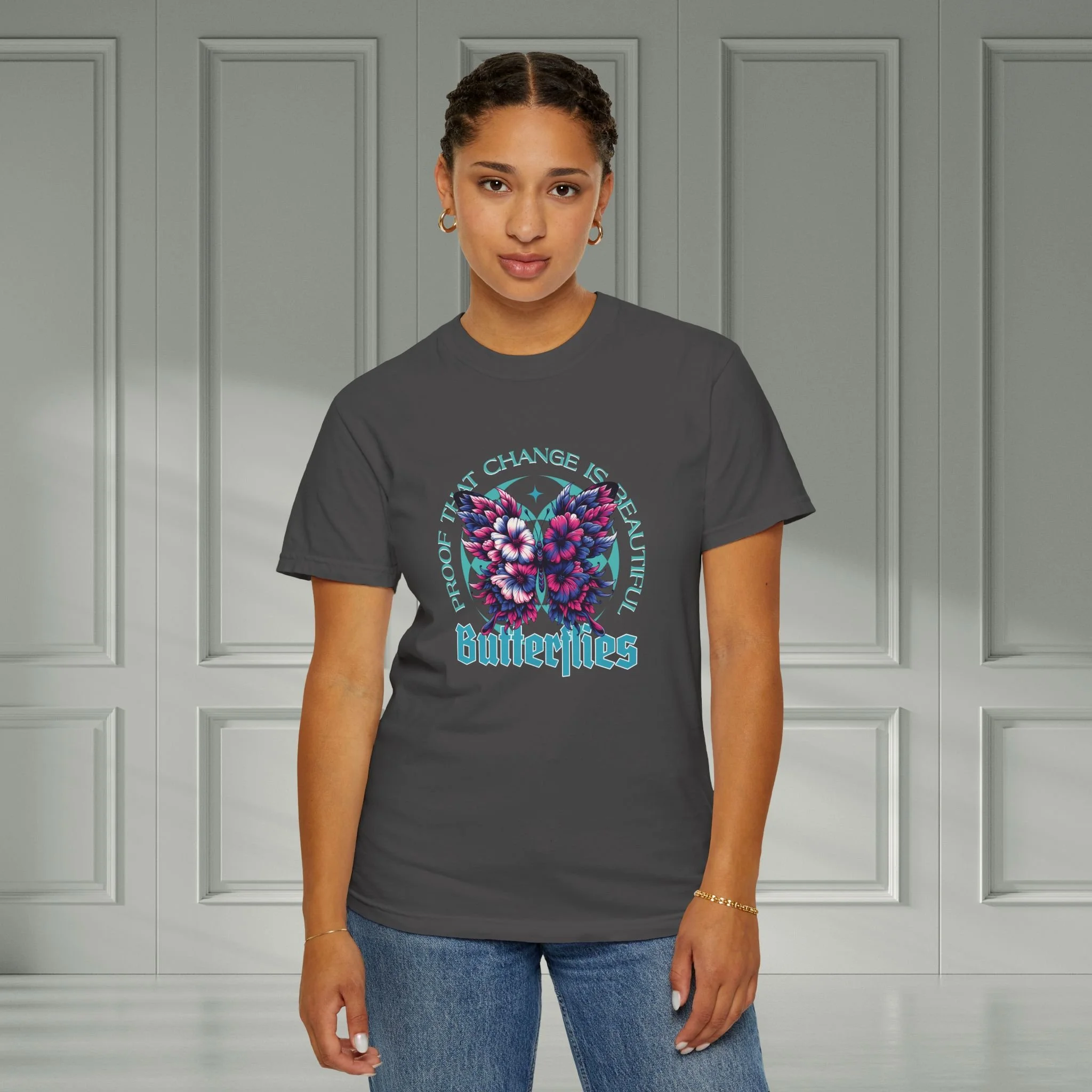 Lightweight yet substantial, this garment-dyed tee carries a nostalgic, vintage-soft hand with a bold, dreamy butterfly print at the chest. The design feels like a late-summer dusk — blooms and wings blurred in teal and magenta, with an old-school typeface that whispers indie concert posters and road-trip playlists. Wear it on slow mornings with jeans and a warm drink, or layered under a denim jacket for nights around a bonfire. It sits relaxed at the shoulder and drapes comfortably across the torso, the kind of shirt you reach for when you want something that already feels lived-in and true to your style.