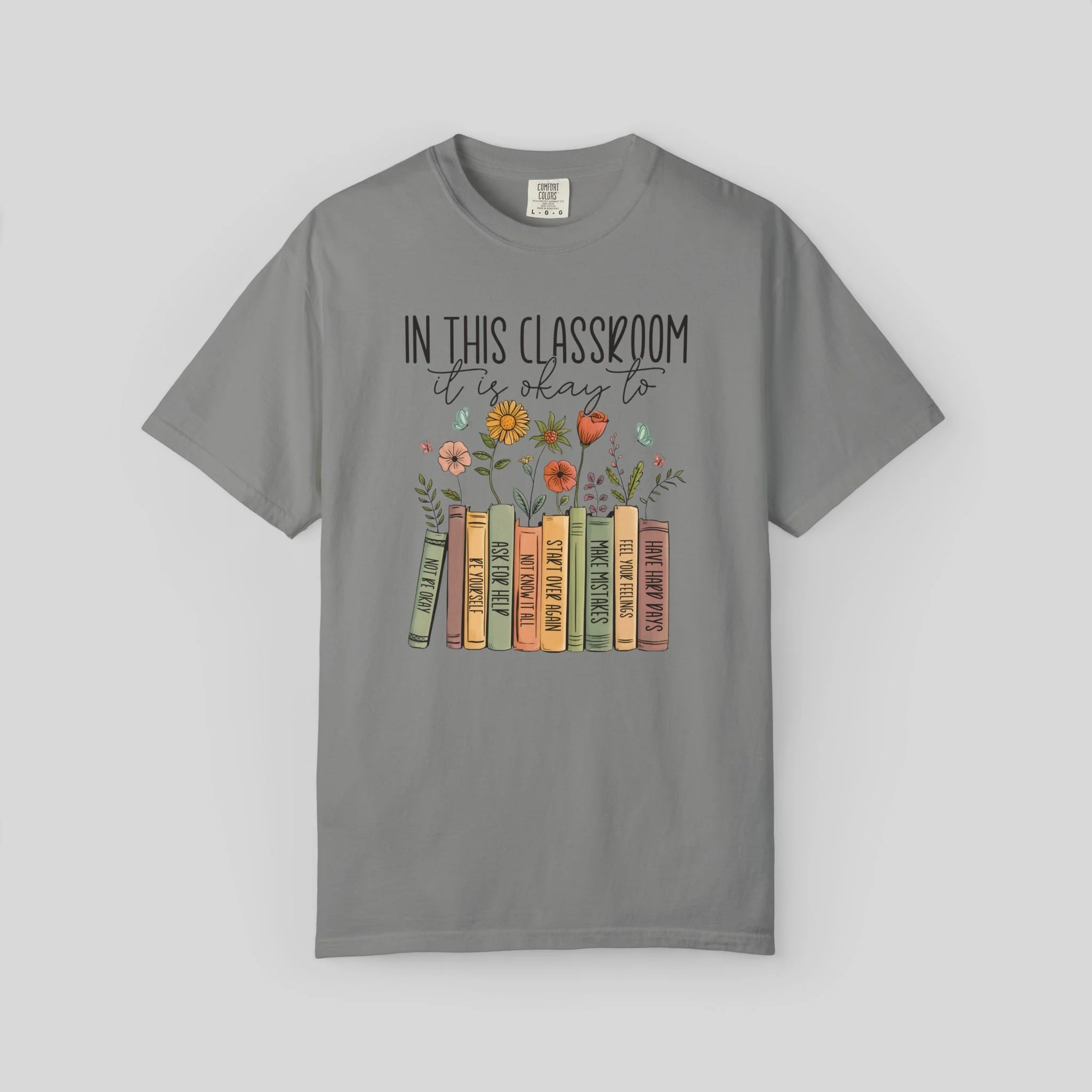 Soft, worn-in cotton that feels like a favorite from day one. This garment-dyed tee brings a gentle vintage wash to a cozy, heavyweight knit — the kind you reach for on busy school mornings or slow weekend afternoons. A row of illustrated books and delicate florals sits across the chest, paired with the hand-lettered line, “In this classroom it’s okay to…” — a quiet invitation that fits into warm, welcoming classrooms and library corners. The relaxed fit and tubular construction keep the silhouette simple and uncluttered, while the double-needle stitching and pre-shrunk ring-spun cotton promise a shirt that stands up to stacks of wash-and-wear.