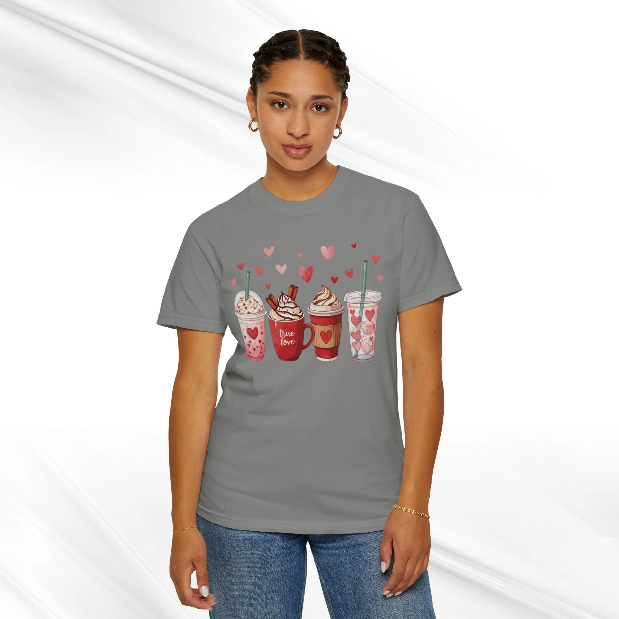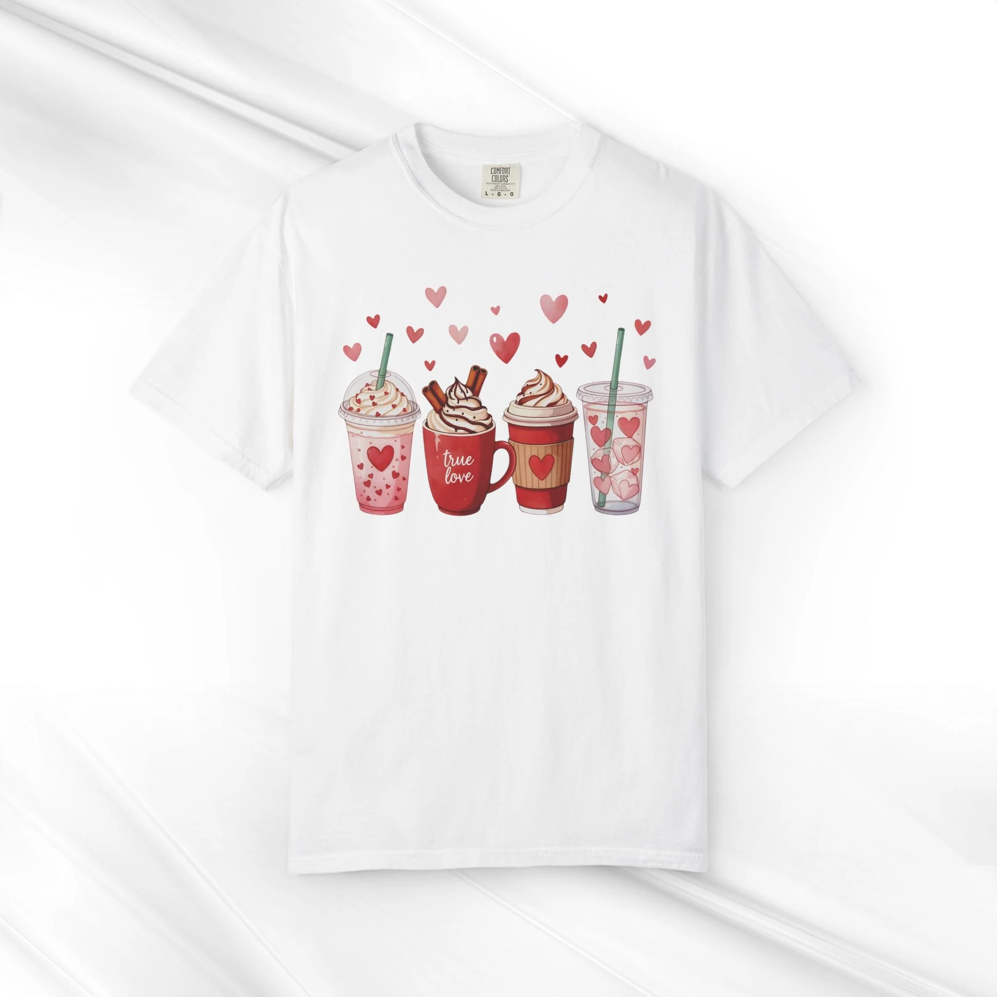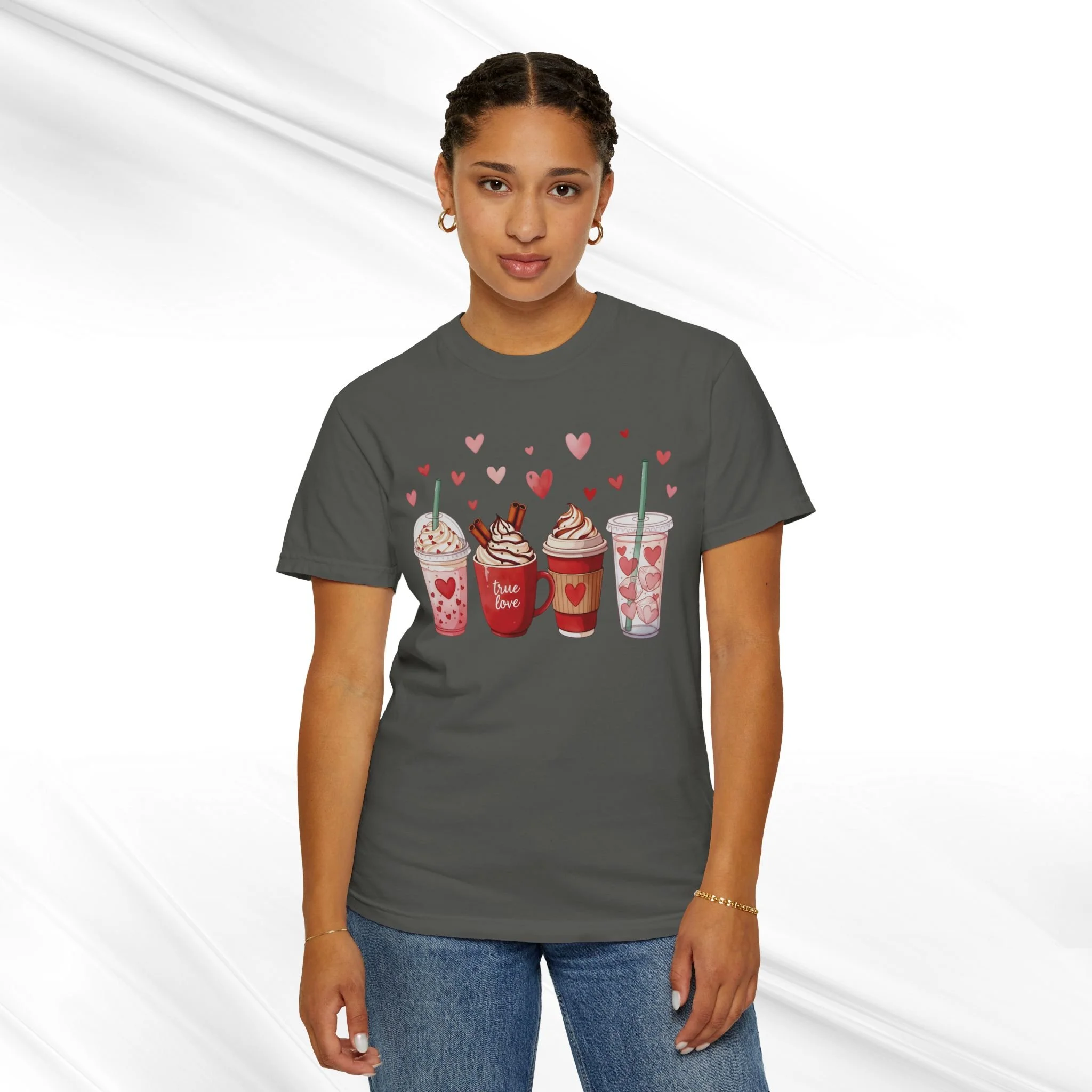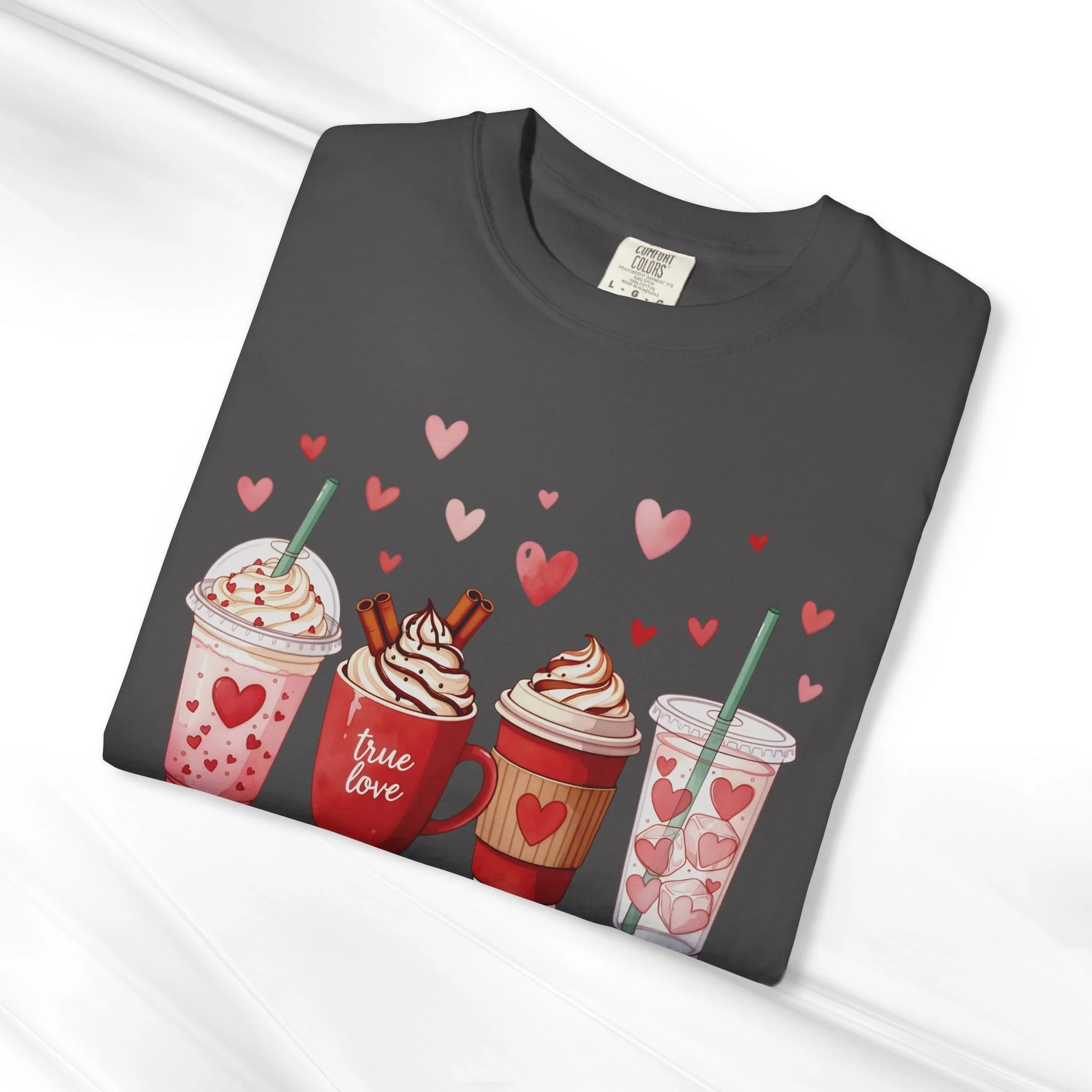 This relaxed-fit tee feels like a warm hug from your favorite café. Garment-dyed and heavyweight, the soft, lived-in cotton holds a playful illustration of four Valentine-themed drinks—whipped cream, heart sprinkles, cozy mugs, and a patterned tumbler—surrounded by drifting hearts. It’s the kind of shirt you reach for on chilly mornings when you want to sip something sweet, stroll to a corner coffee shop, or curl up with a steaming mug and a good playlist. The sturdy stitching and tubular knit give it a clean, timeless silhouette that ages beautifully with each wash, while the range of sizes and many colorways let you pick the shade that suits your everyday rhythm.