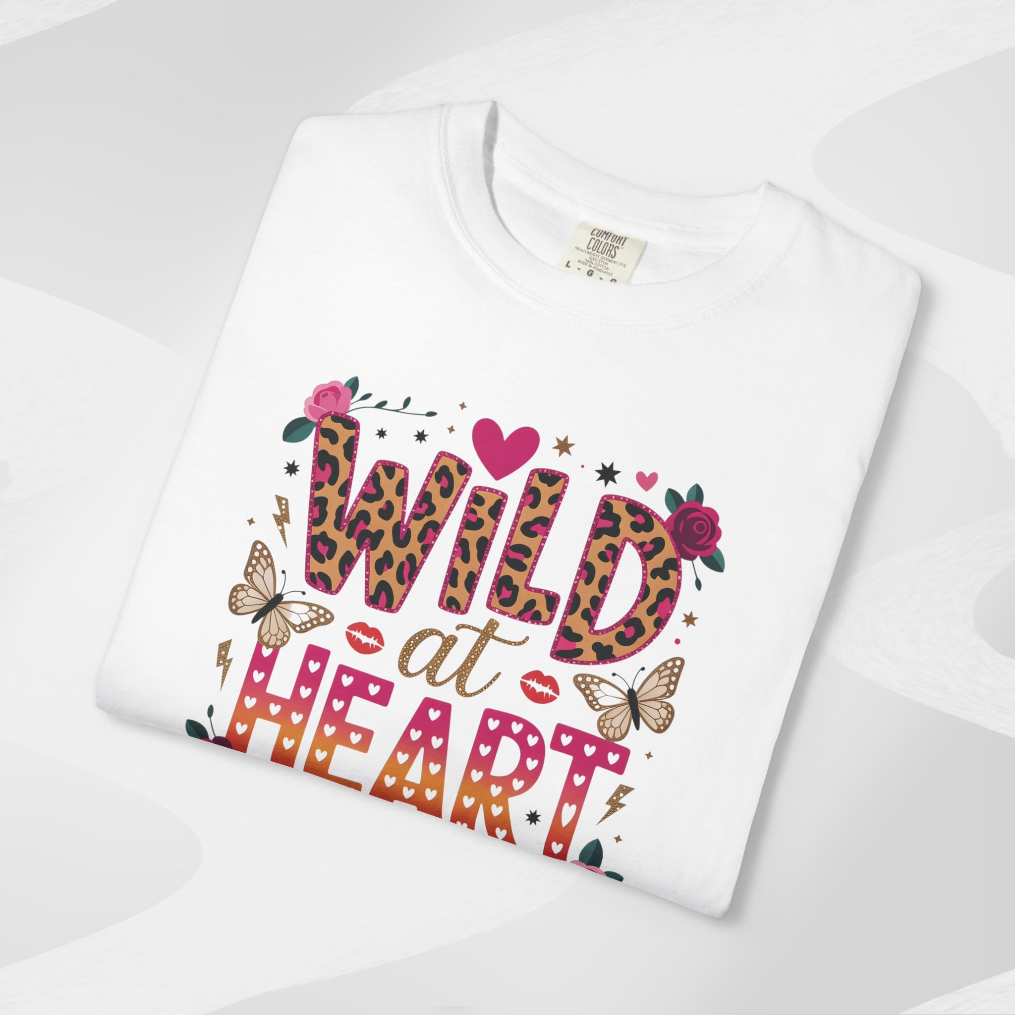 This relaxed-fit, garment-dyed tee brings playful energy and soft vintage texture to everyday wear. The front design — a bold, hand-lettered “Wild at Heart” with leopard print fills, heart motifs and floral accents — reads like a spirited note from a free soul. The heavyweight, ring-spun cotton feels substantial yet broken-in thanks to post-construction dyeing, so the color and finish soften with each wash. Wear it over leggings for a weekend coffee run, layered under a denim jacket for a concert, or lounging at home while curled up with a notebook.
