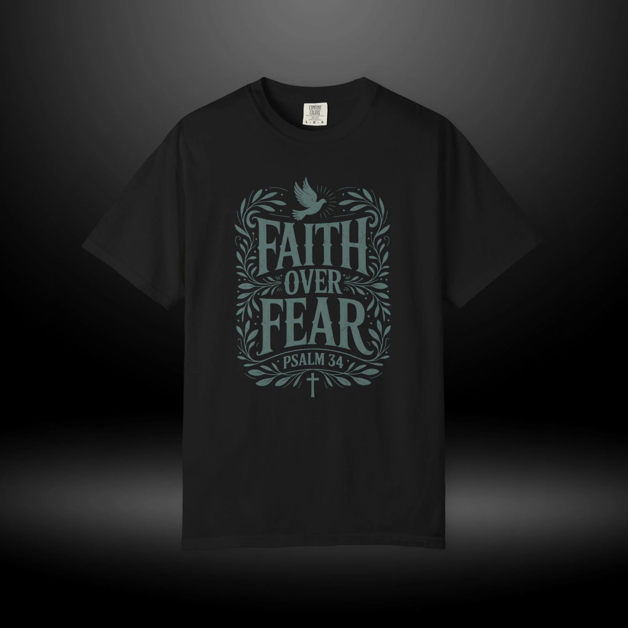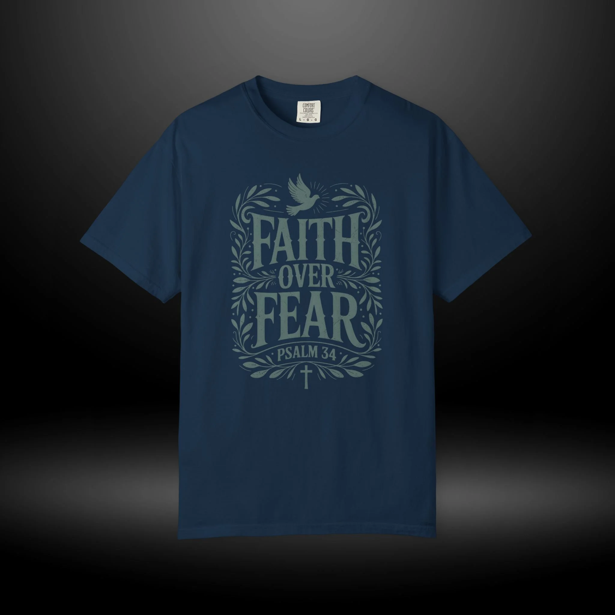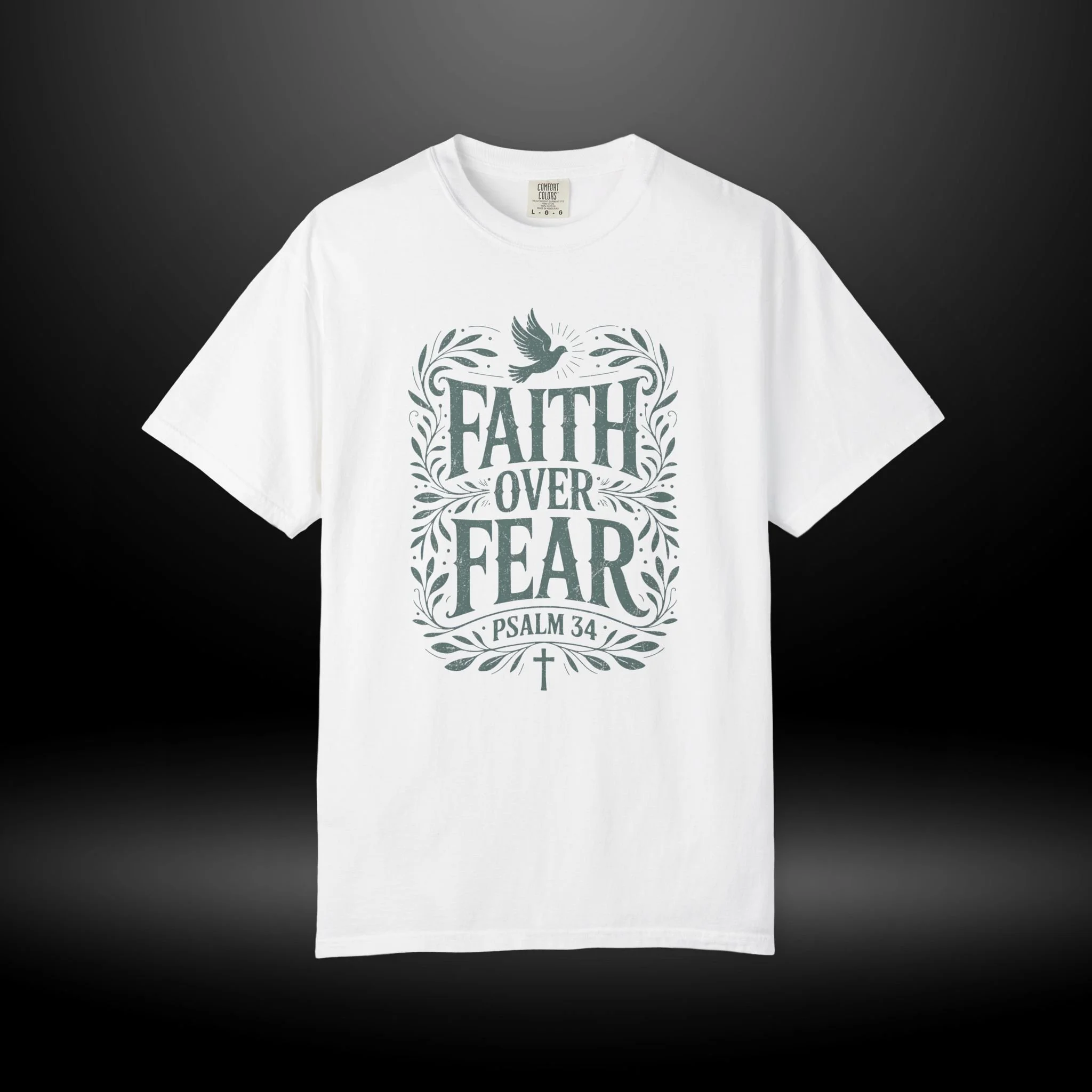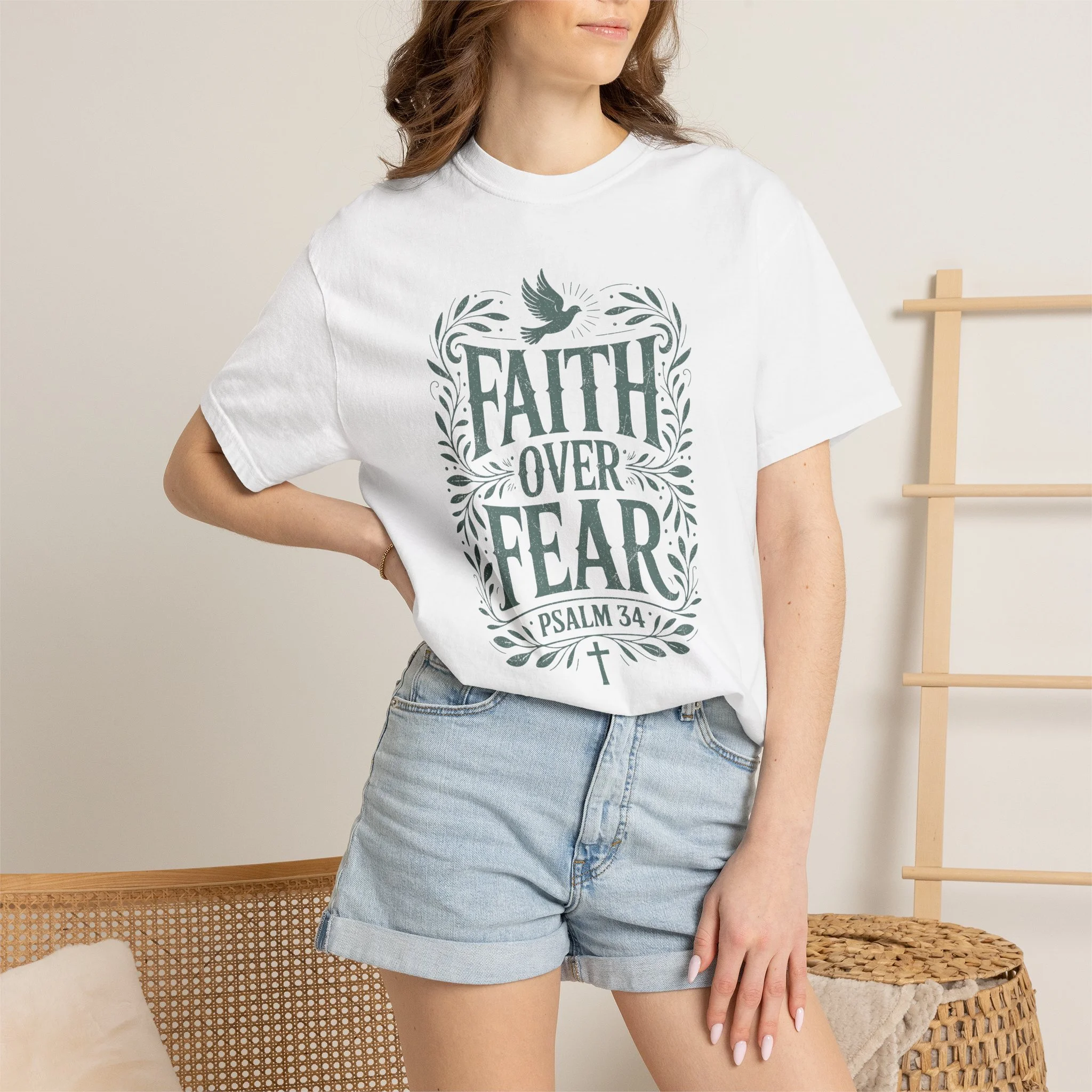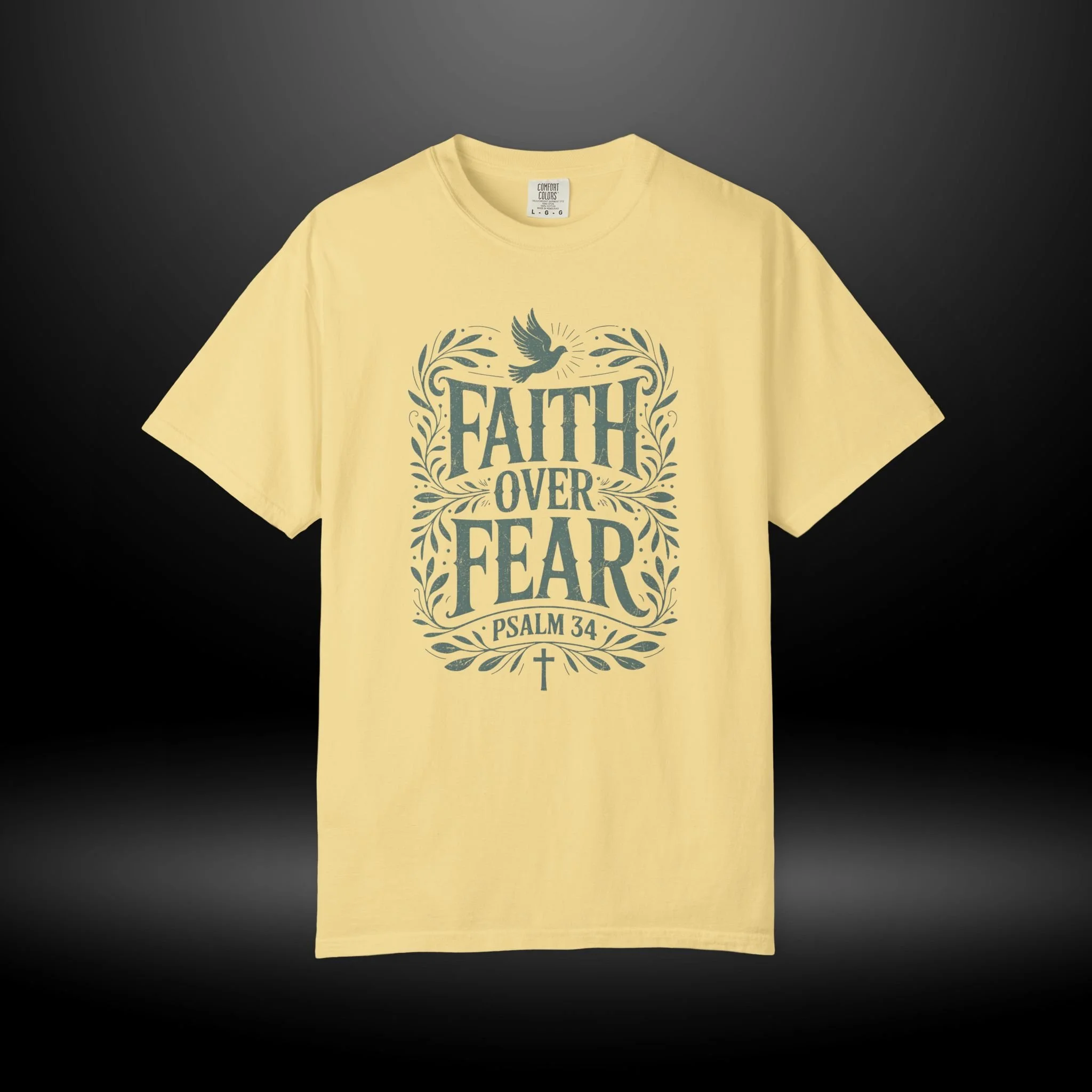 Soft, sturdy, and quietly inspirational — this garment-dyed tee wraps everyday wear in a calm reminder: Faith Over Fear. The muted, vintage-wash cotton feels lived-in from the first wear, while the hand-drawn lettering and leafy frame with a small dove give the design a gentle, hopeful presence. It sits comfortably on the shoulders and drapes in a relaxed fit, becoming the kind of shirt you grab when you want your outfit to reflect what matters without shouting. Wear it to church gatherings, low-key outreach events, or just on slow Sunday mornings when you need a steadying thought. The heavyweight cotton and garment-dyed finish age with character, so each wash softens the color and makes the tee feel more personal over time.