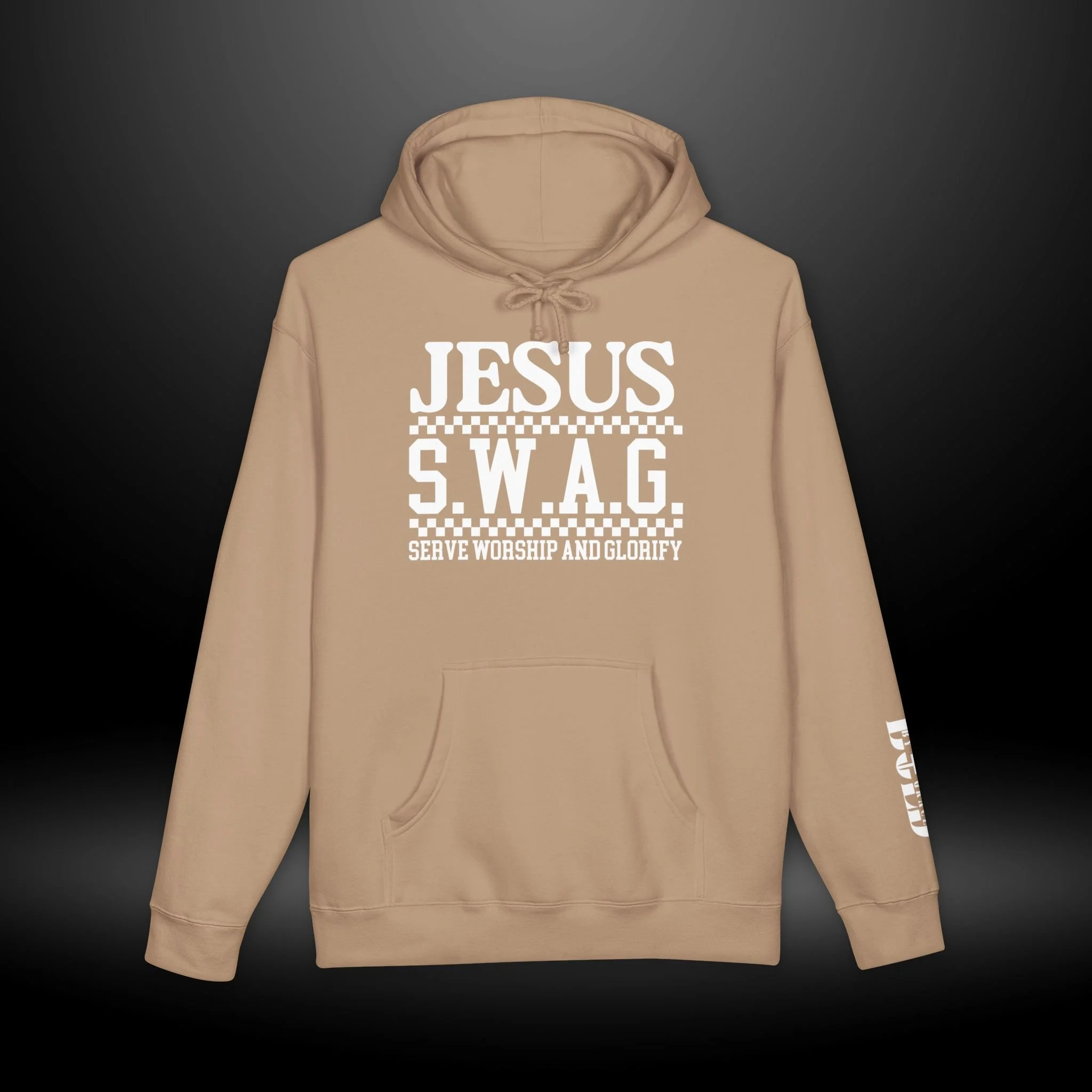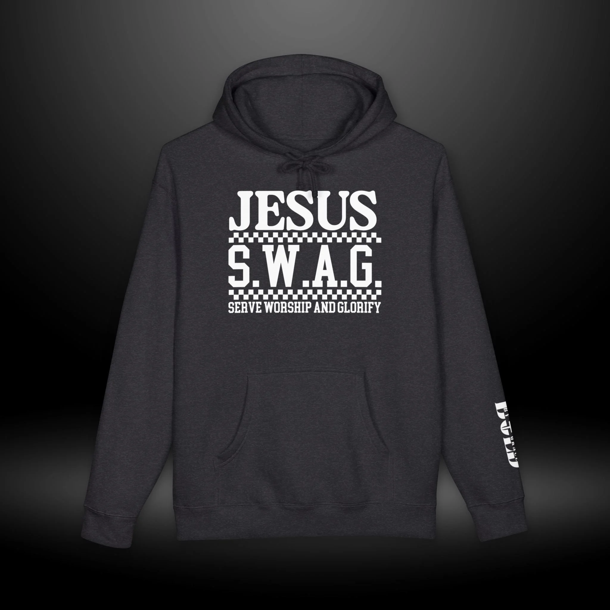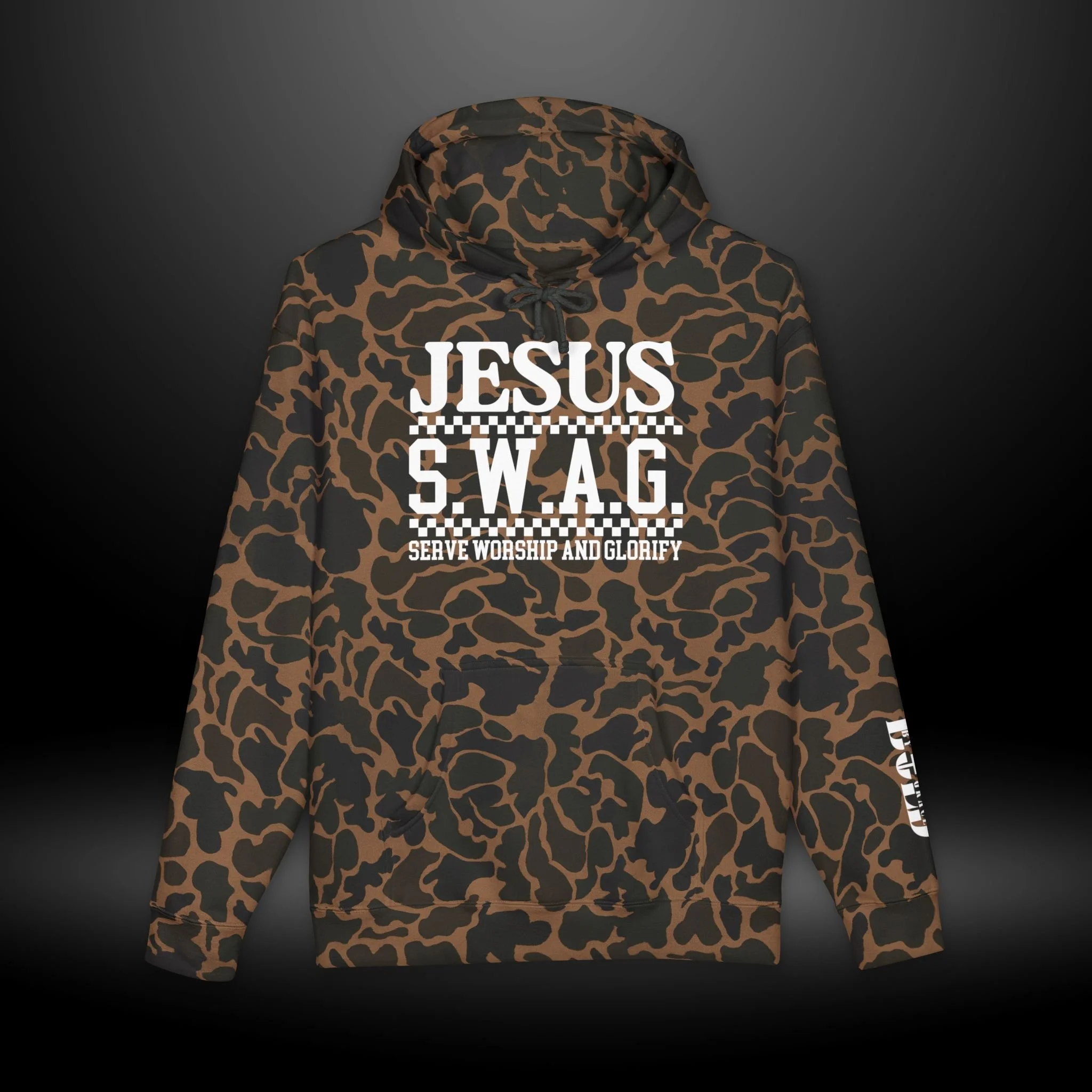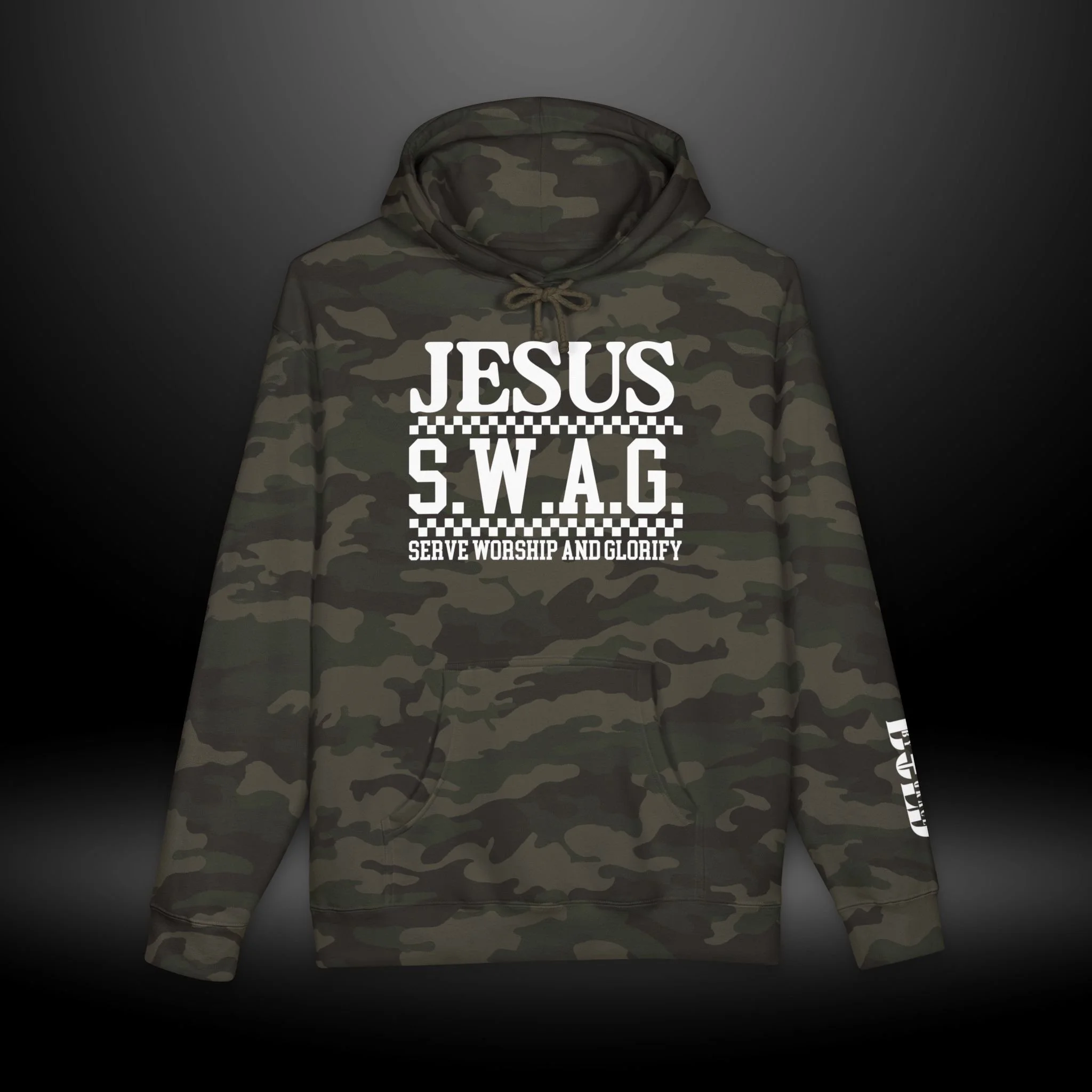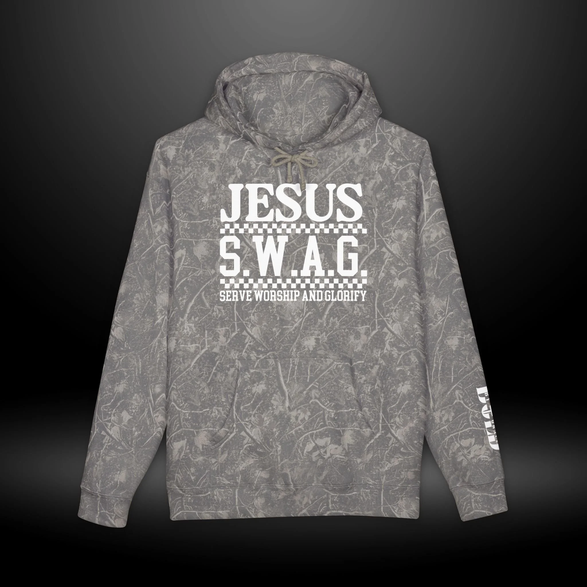 This heavyweight hooded sweatshirt brings faith-forward style to cool, quiet mornings and late-night meetups. This hoodie is available in various camo and other colors, featuring bold black lettering across the chest that reads ‘JESUS S.W.A.G.’ with a subtle checkerboard accent and a small scripture-inspired line beneath — a confident, low-key way to wear your beliefs. The roomy cut and fleece-lined hood create a cozy, protective layer for weekend worship walks, volunteer shifts, or energy-filled worship nights. Sleeve text adds an extra touch of intentional branding without shouting. It’s built to feel broken-in from the first wear while holding its shape through seasons of service and life.