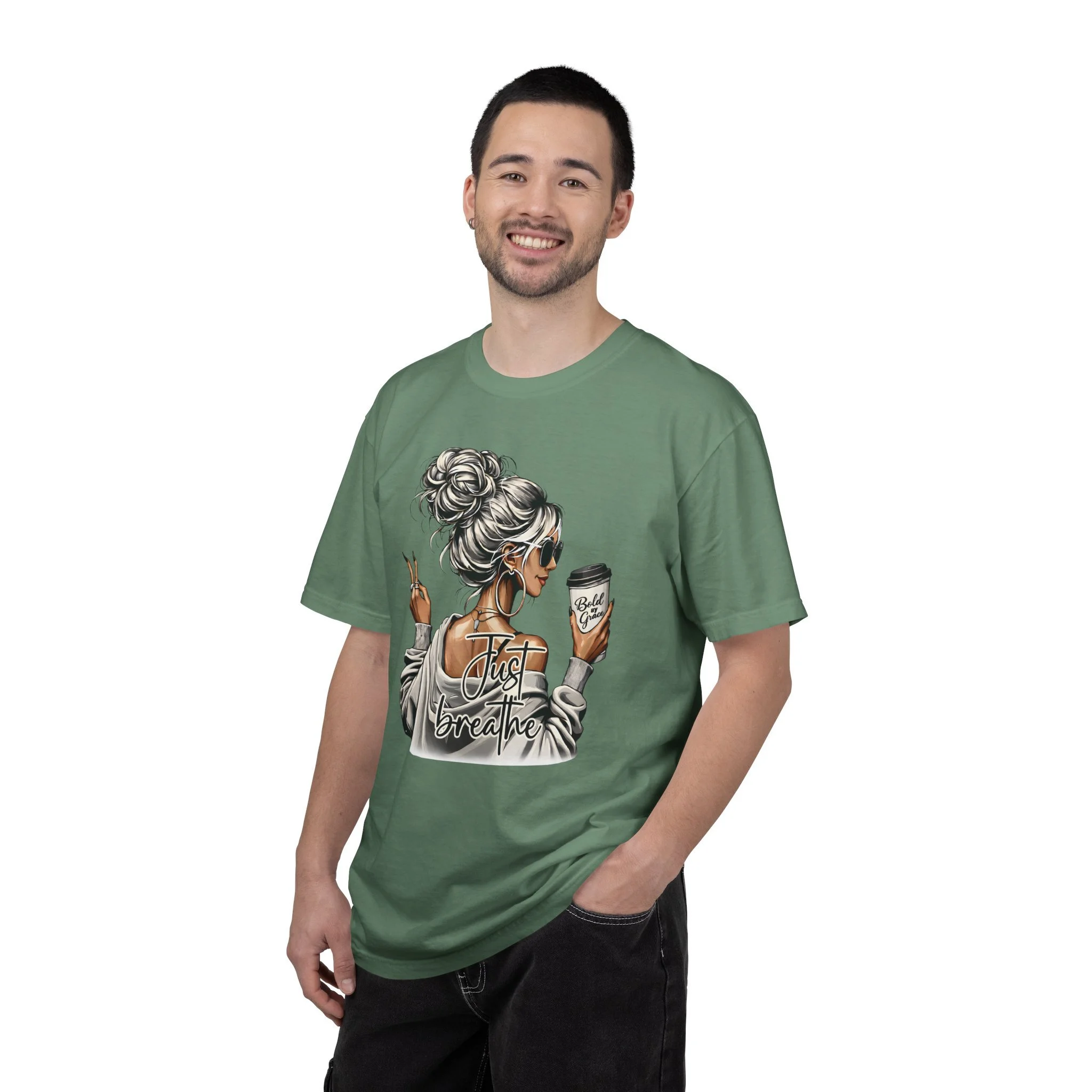 A soft, garment-dyed Comfort Colors tee that feels lived-in from the first wear. The relaxed, heavyweight cotton drapes comfortably while showcasing a casual, confident illustration of a woman with a messy bun holding a coffee and flashing a peace sign—text reading ‘Just breathe’ woven into the design. It’s a quiet, everyday statement piece for slow mornings, coffee runs, and moments when you need a gentle reminder to pause. The durable double-needle stitching and tubular knit keep the shirt looking neat wash after wash, while the pre-shrunk, ring-spun cotton and wide size range mean it’s an easy, reliable choice for a relaxed wardrobe staple.