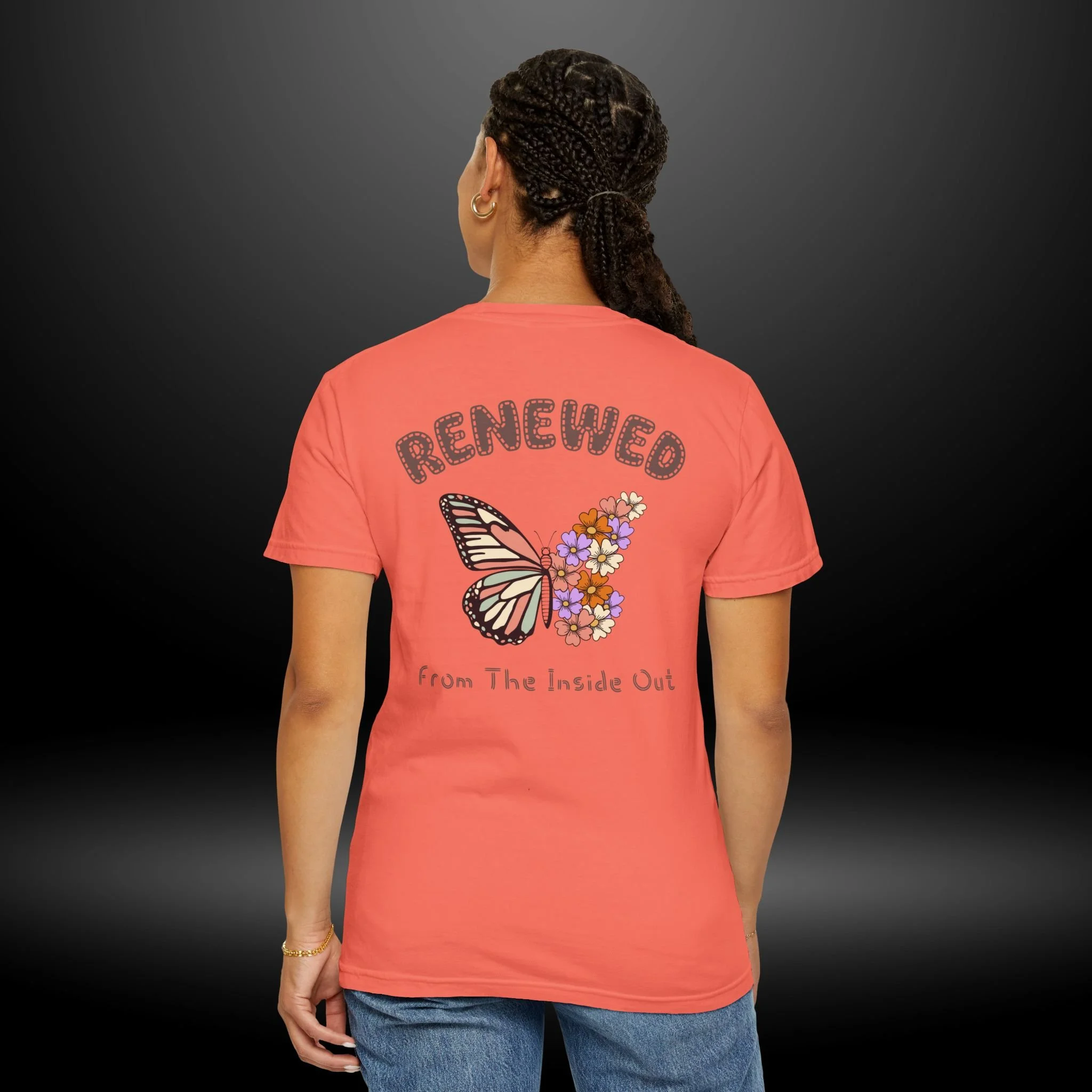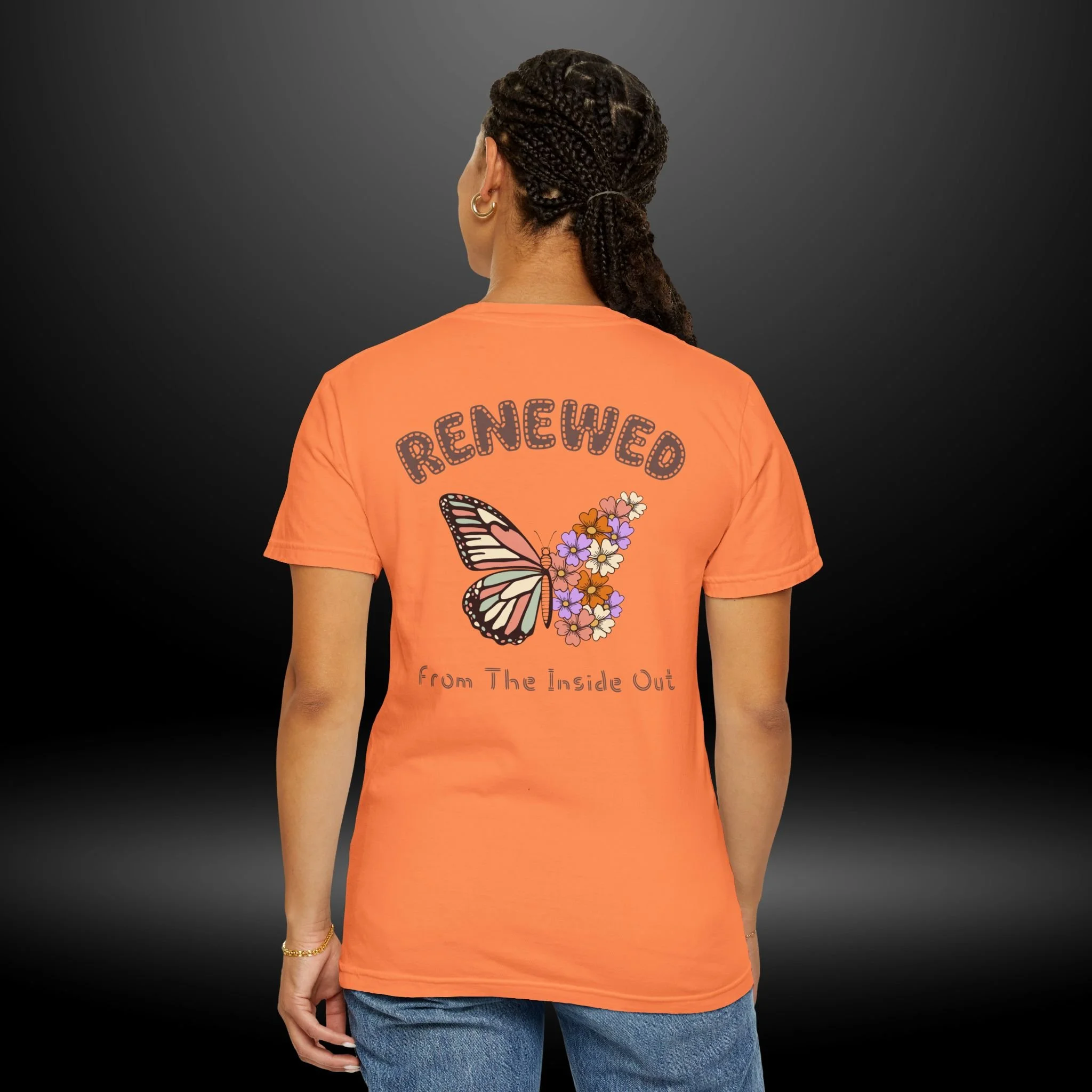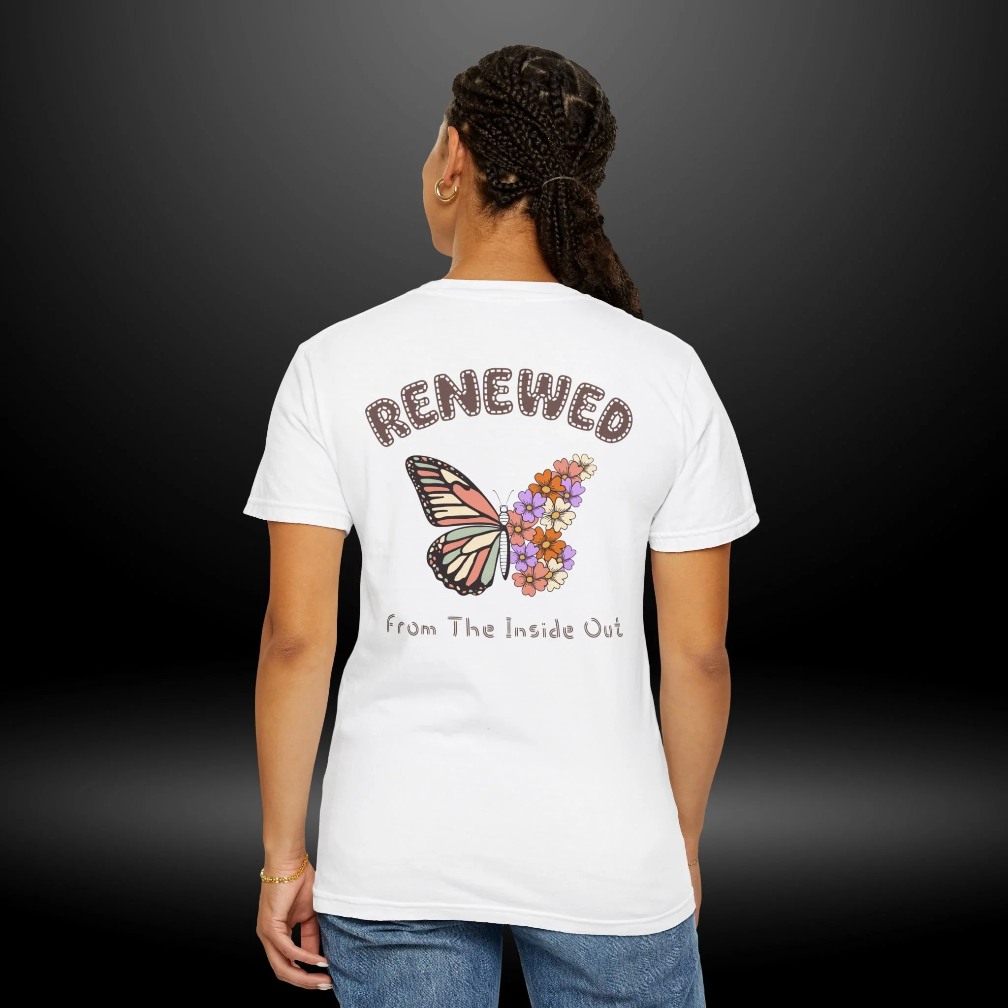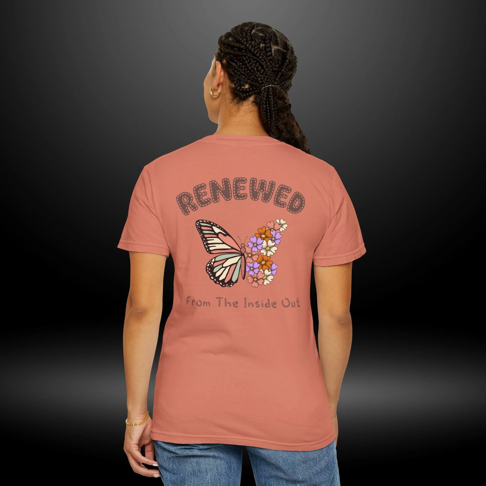 This heavyweight garment-dyed tee carries a quiet, hopeful energy. A soft, worn-in feel meets a delicate design: a monarch wing blooming into a cluster of tiny flowers on the chest, and a larger version on the back framed by the word “RENEWED” and the phrase “From The Inside Out.” Wear it as a reminder for yourself & others, during recovery walks, or at intimate gatherings where stories of change are shared. The relaxed fit and garment-dyed finish give it a lived-in look that complements layered outfits — throw on a flannel, tuck it into high-waist jeans, or let it hang loose during a reflective afternoon. The message reads as both personal and communal: growth that starts within and shows up in small, beautiful ways.