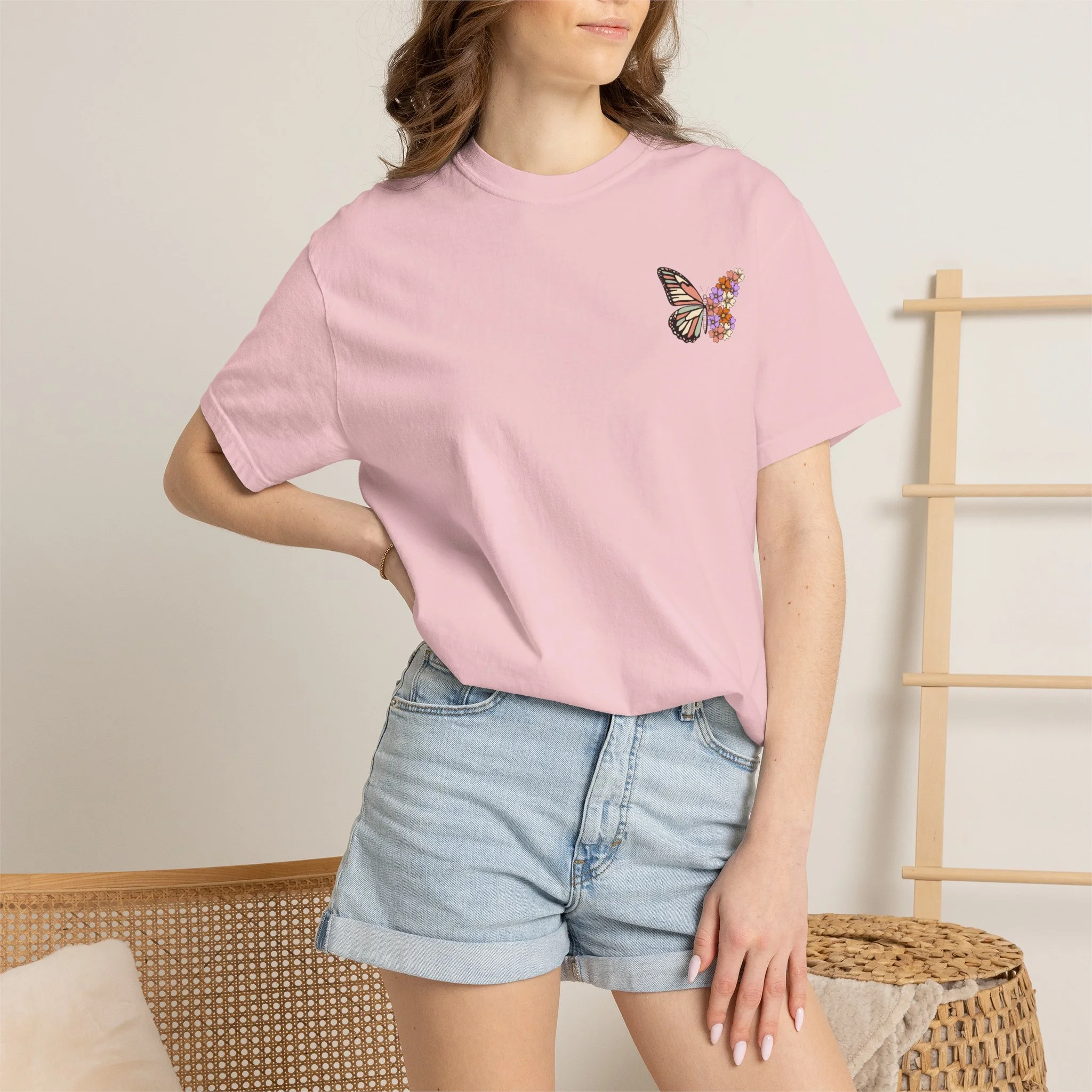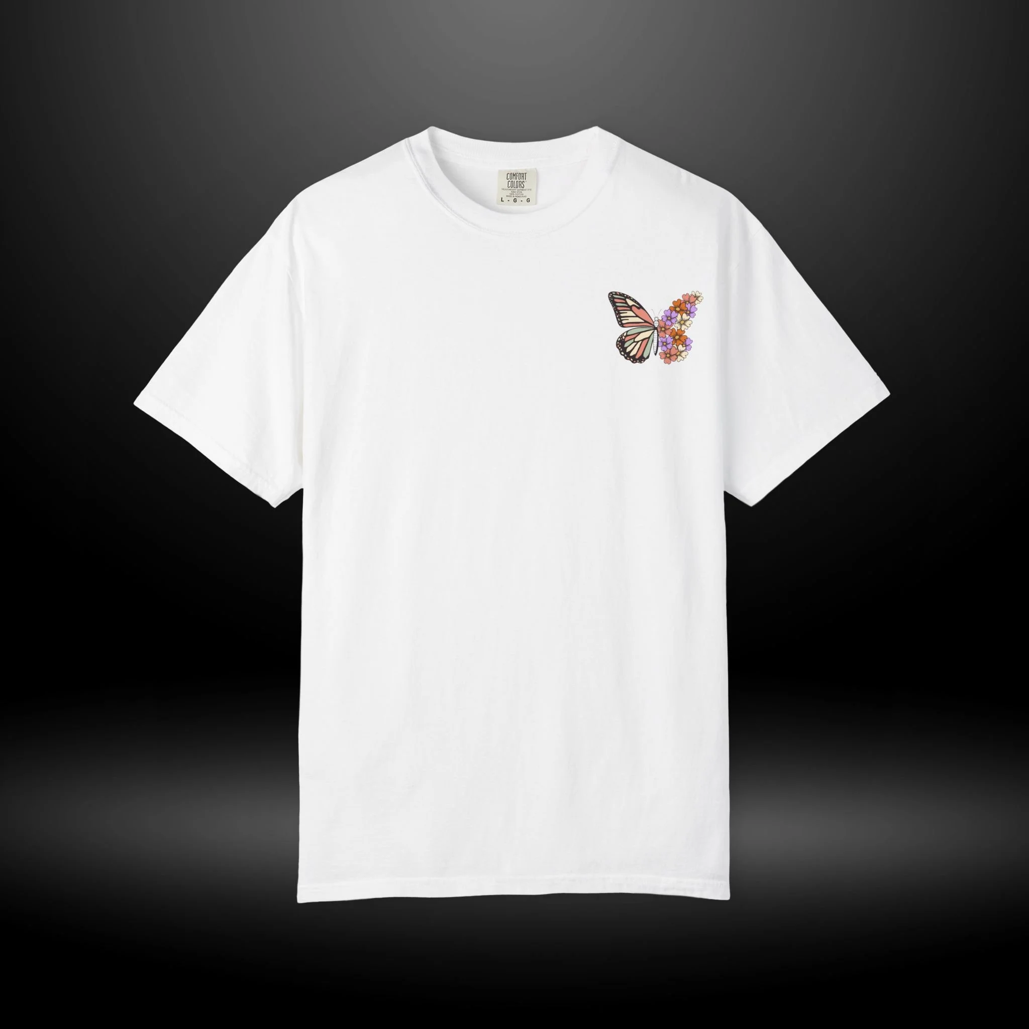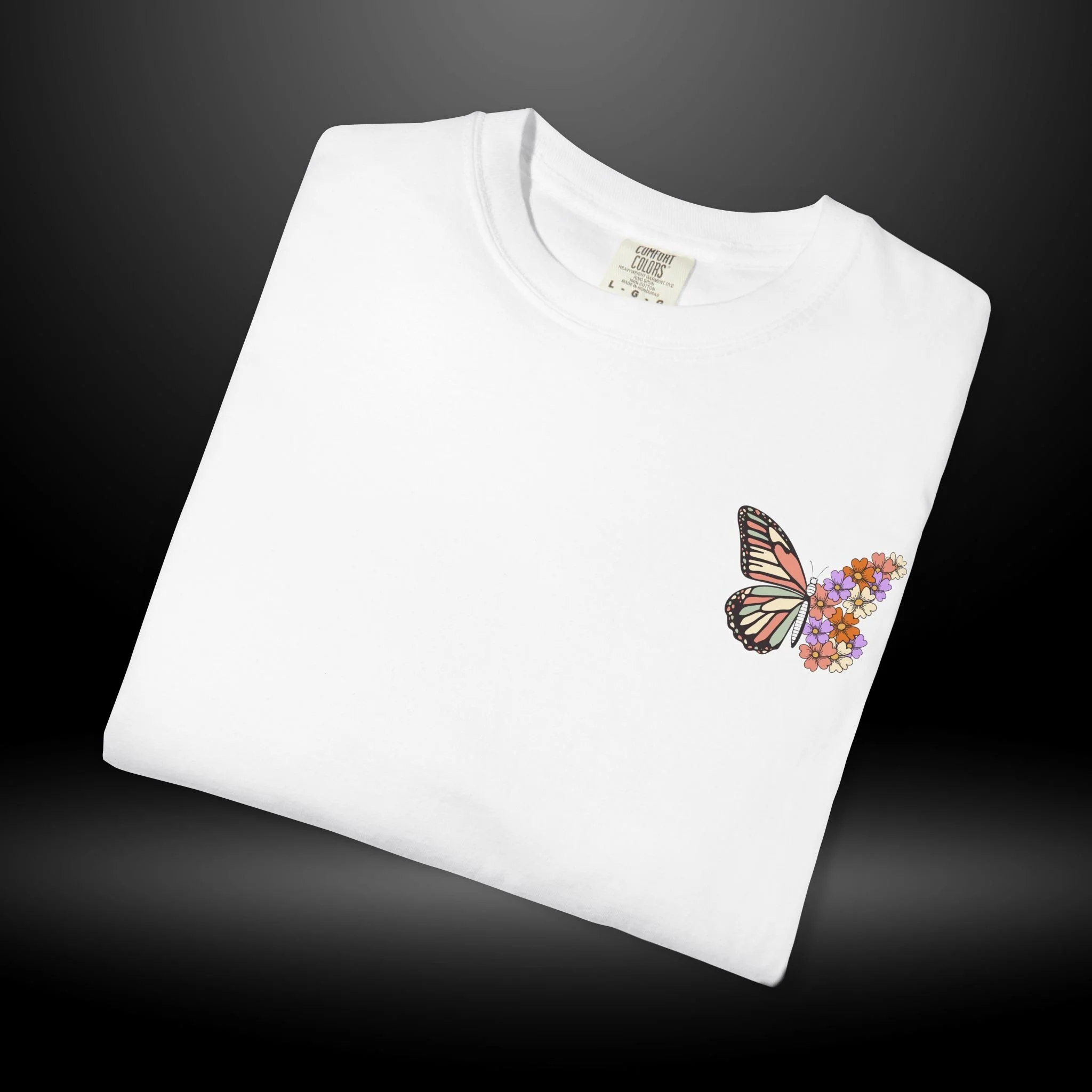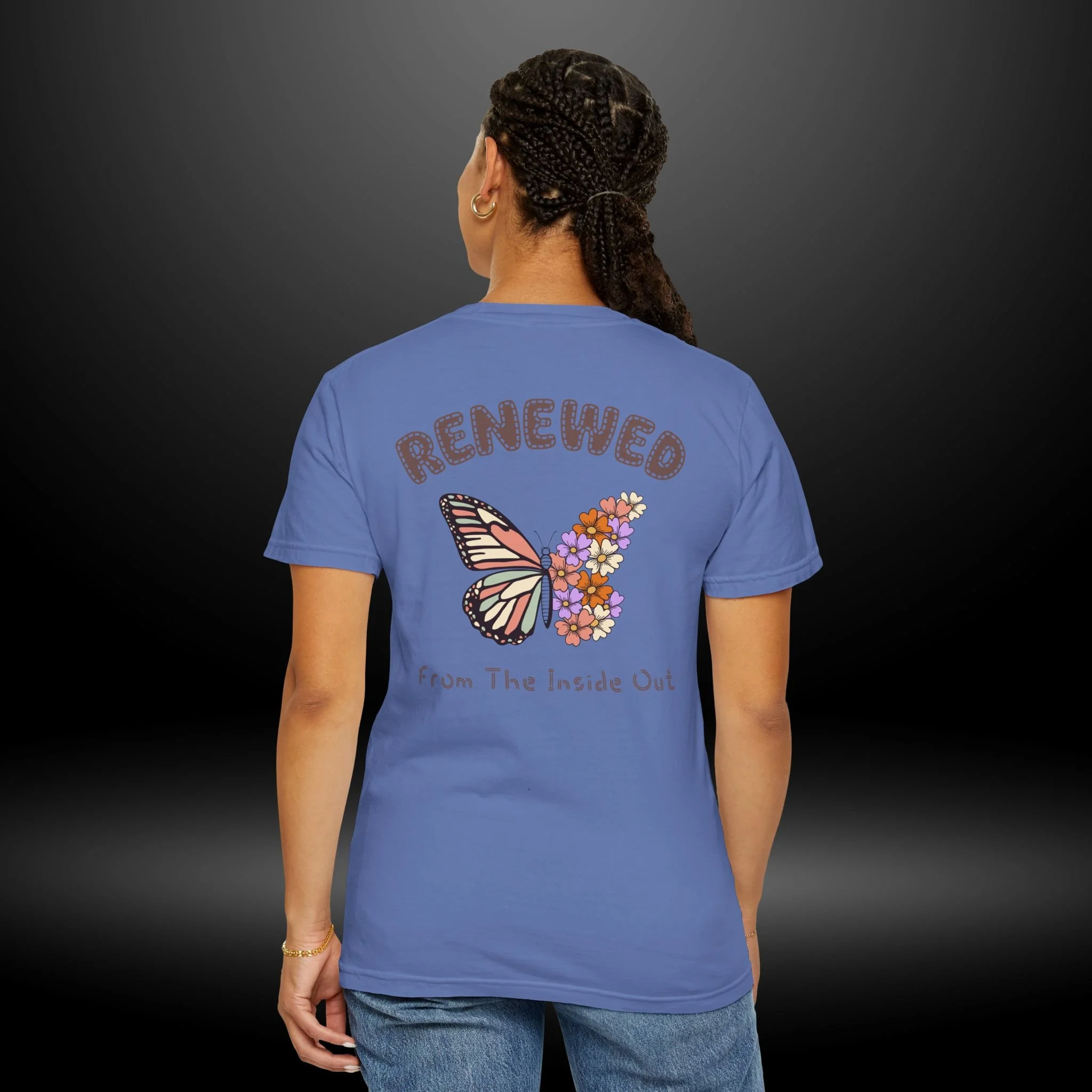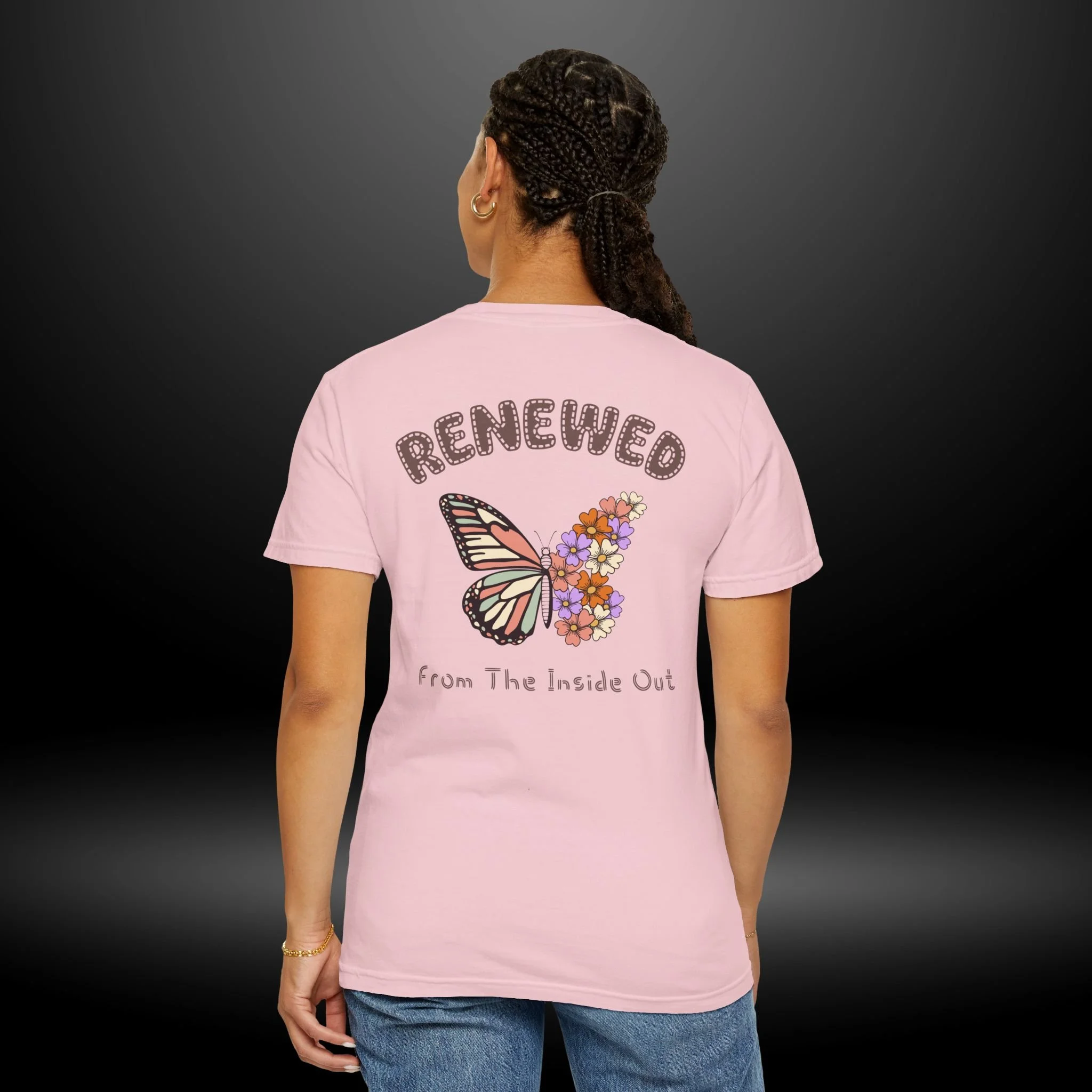This heavyweight garment-dyed tee carries a quiet, hopeful energy. A soft, worn-in feel meets a delicate design: a monarch wing blooming into a cluster of tiny flowers on the chest, and a larger version on the back framed by the word “RENEWED” and the phrase “From The Inside Out.” Wear it as a reminder for yourself & others, during recovery walks, or at intimate gatherings where stories of change are shared. The relaxed fit and garment-dyed finish give it a lived-in look that complements layered outfits — throw on a flannel, tuck it into high-waist jeans, or let it hang loose during a reflective afternoon. The message reads as both personal and communal: growth that starts within and shows up in small, beautiful ways.