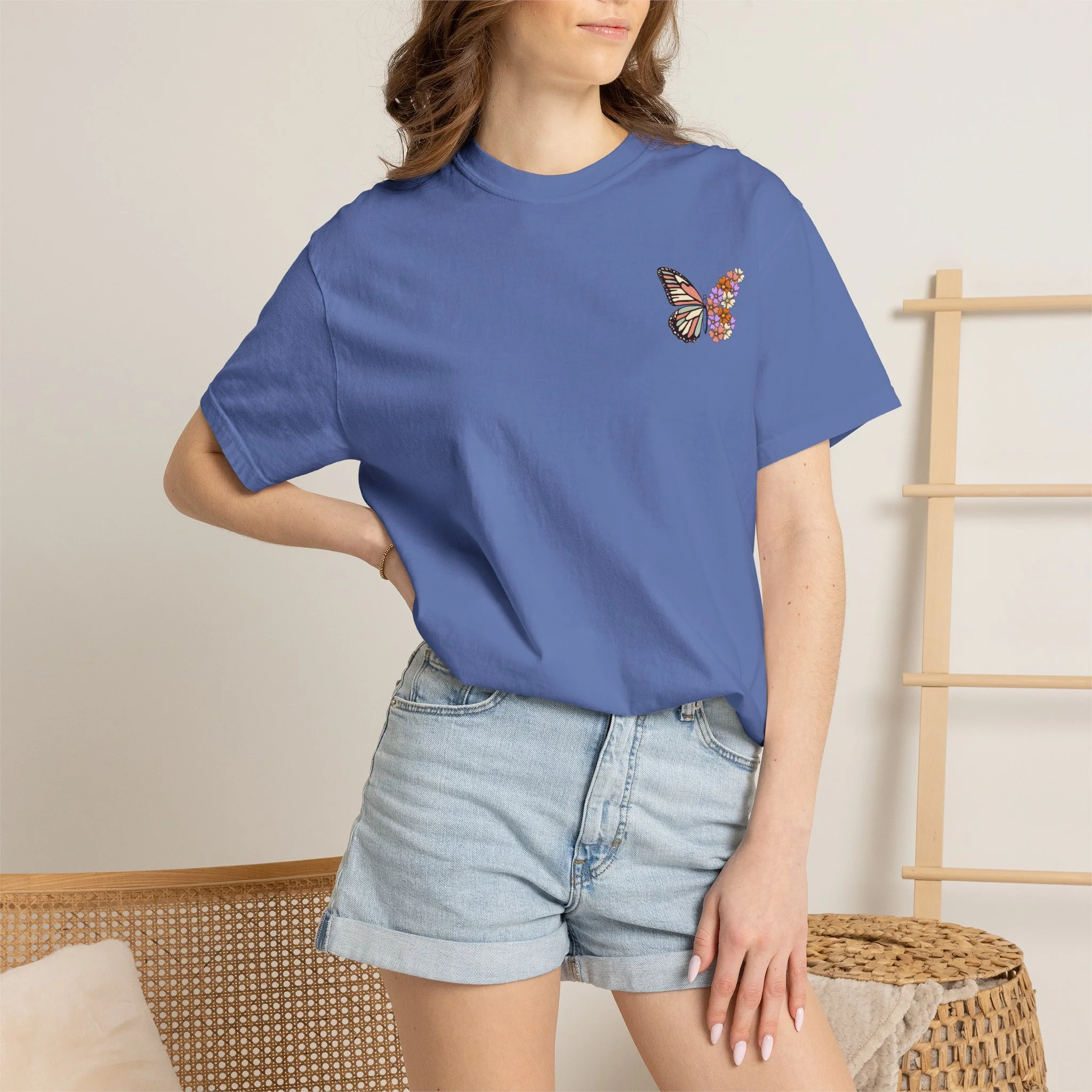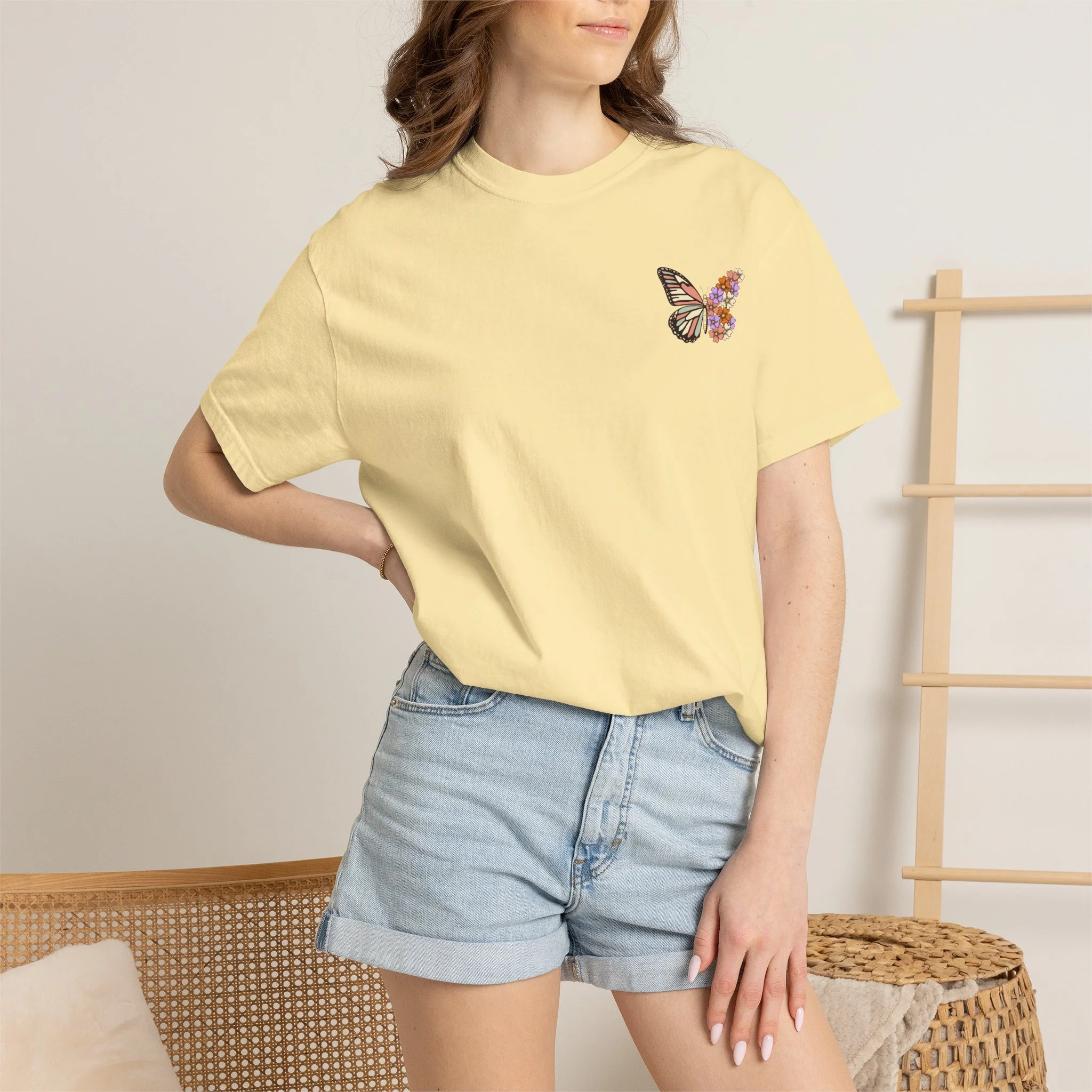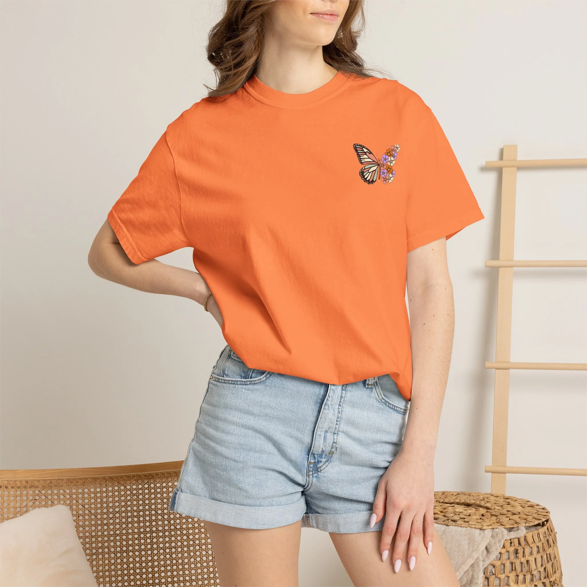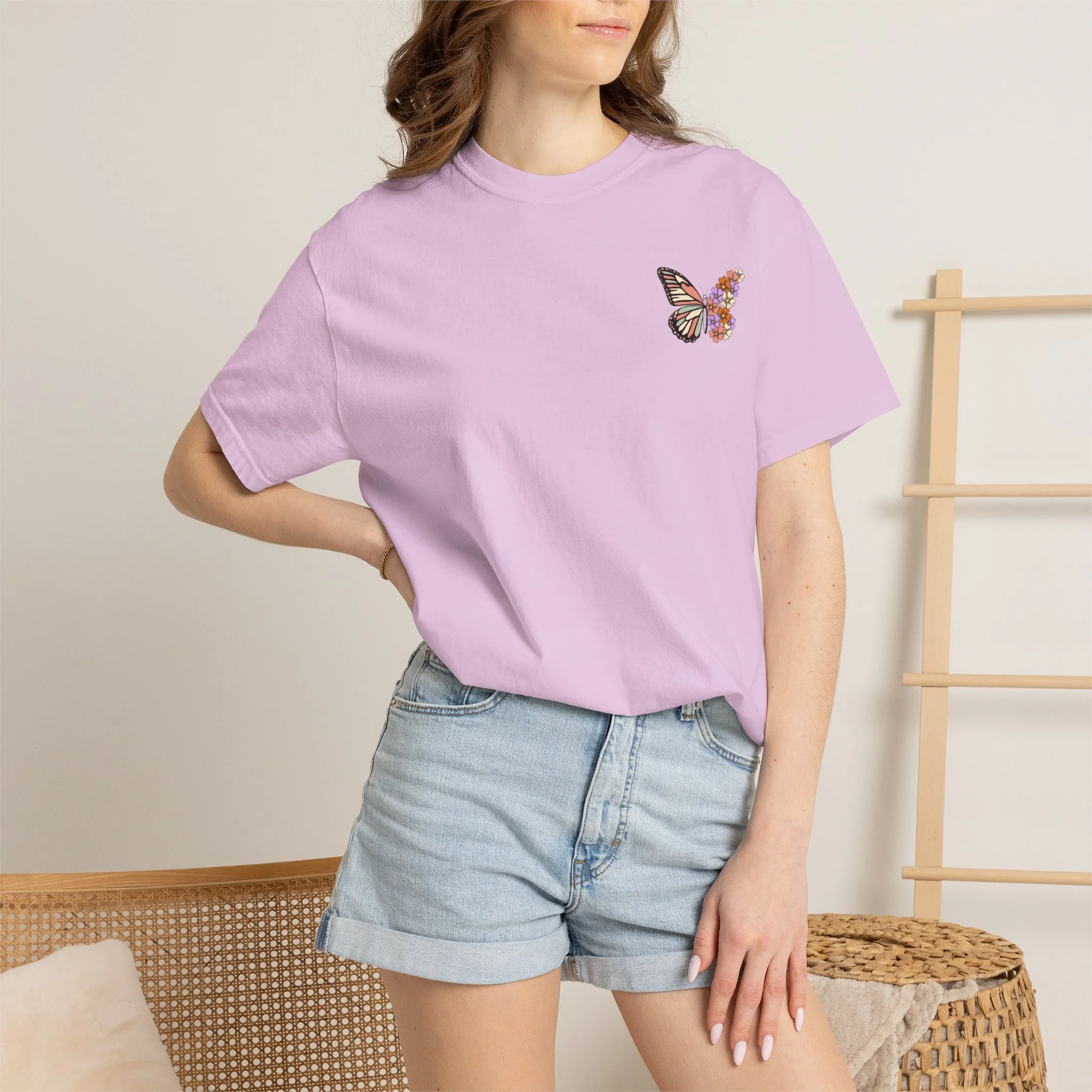 This heavyweight garment-dyed tee carries a quiet, hopeful energy. A soft, worn-in feel meets a delicate design: a monarch wing blooming into a cluster of tiny flowers on the chest, and a larger version on the back framed by the word “RENEWED” and the phrase “From The Inside Out.” Wear it as a reminder for yourself & others, during recovery walks, or at intimate gatherings where stories of change are shared. The relaxed fit and garment-dyed finish give it a lived-in look that complements layered outfits — throw on a flannel, tuck it into high-waist jeans, or let it hang loose during a reflective afternoon. The message reads as both personal and communal: growth that starts within and shows up in small, beautiful ways.